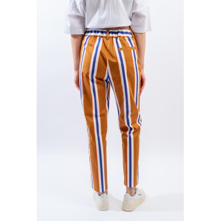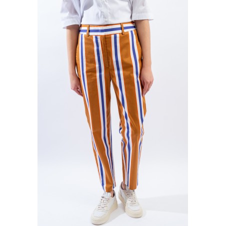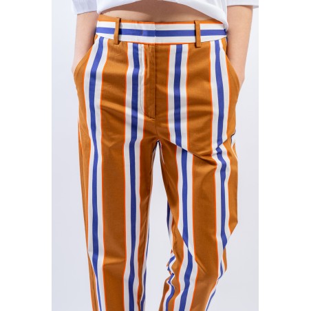 Pantalone Niu con taglio da uomo realizzato in misto cotone. Presenta chiusura con gancetto metallico bottone nascosto e zip, tasche alla francese e gamba diritta. Impreziosito dalla stampa con fantasia a righe verticali e cinturino in vita con passanti ed elastico sul retro.