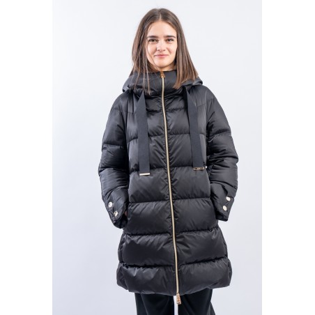 Piumino di media lunghezza Herno realizzato in morbido Nylon effetto raso. Il cappuccio è vaporoso e avvolgente rifinito con maxi coulisse in gros grain e fondo dorato. I polsi impreziositi da coppia di bottoni dorati che richiamano la chiusura centrale con zip a doppio cursore. Il modello è caldo e confortevole, imbottito in piuma d'oca. La vestibilità è regolare.