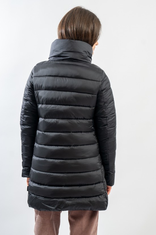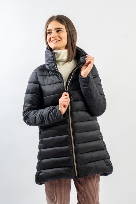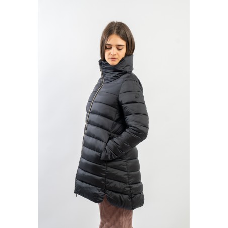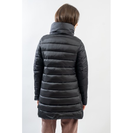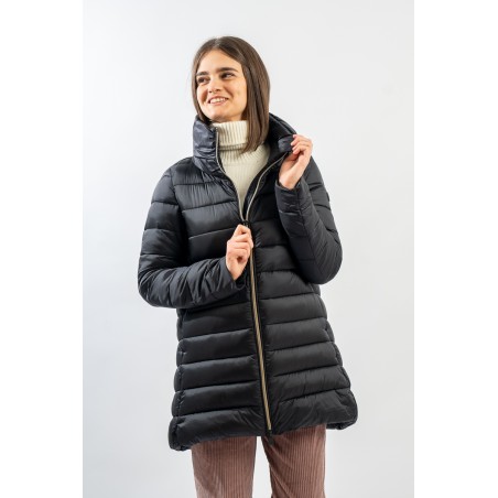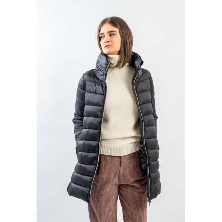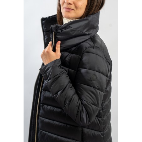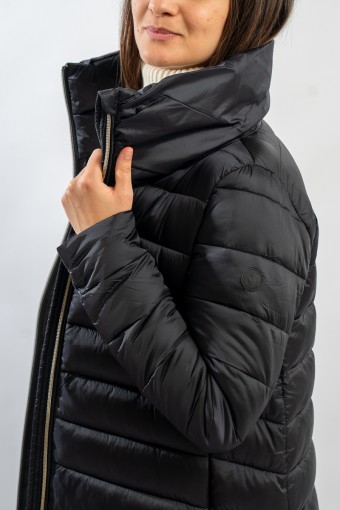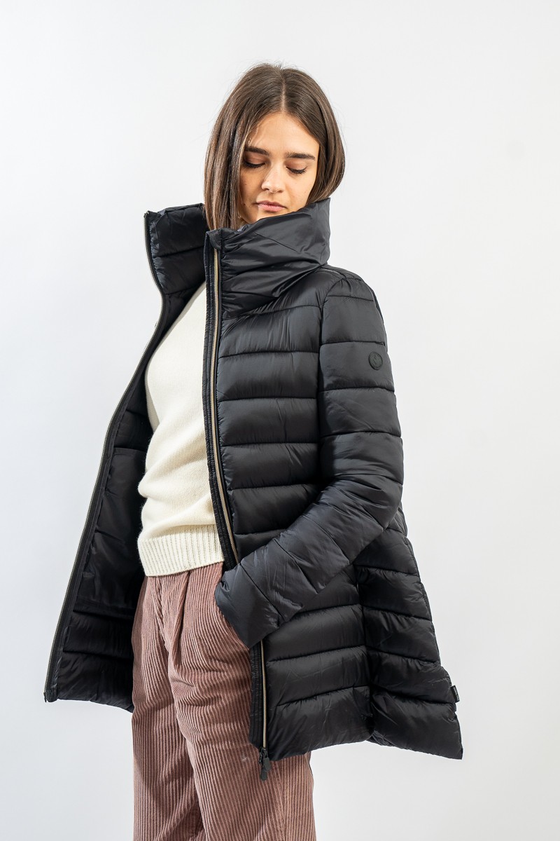Eco piumino lunghezza media con vestibilità ad A e collo vulcano. Il tessuto esterno semi lucido dona lucentezza e ne esalta i colori. L'imbottitura in plumtech, piuma sintetica riciclata, è un'ottima alternativa al vero piumino e garantisce un perfetto isolamento termico. Sottile ma allo stesso tempo resistente, garantisce protezione dall'acqua e dall'aria. La chiusura centrale con zip dorata e doppio cursore. Il logo gommato tono su tono applicato sulla manica e doppie tasche laterali con chiusura a zip invisibili. Caldo e confortevole, il capo che ti accompagnerà dall'autunno alla primavera.