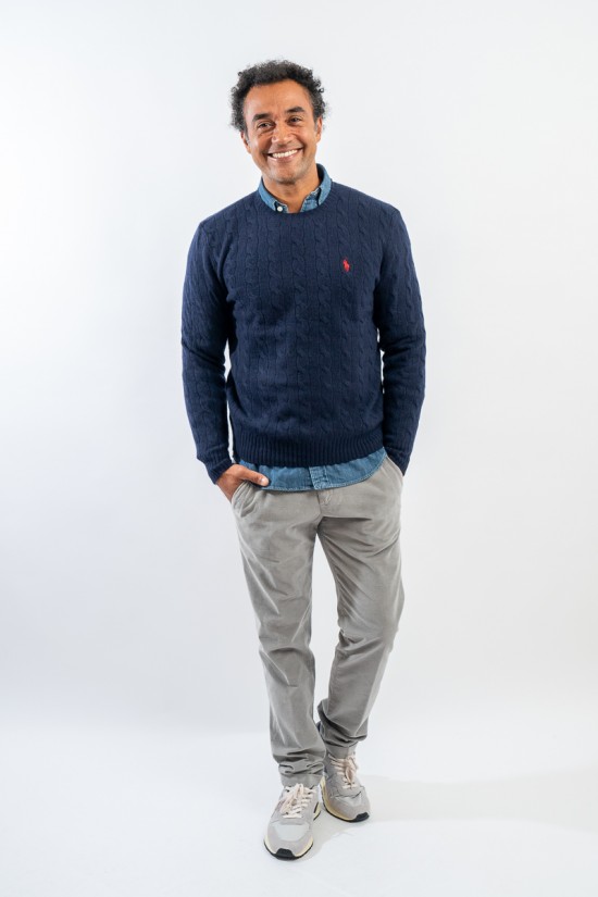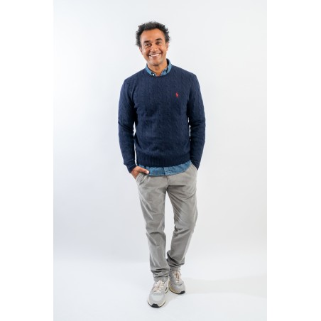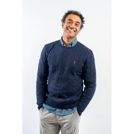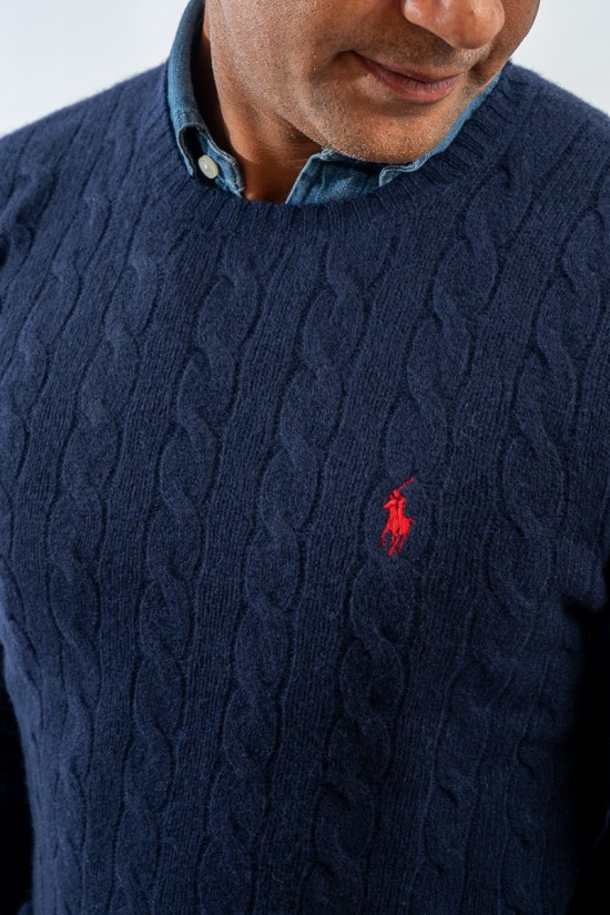 Morbido maglioncino in misto lana e cashmere a tinta unita con raffinata lavorazione a treccia. Impreziosito dall' iconico pony ricamato a rilievo e a contrasto di colore. Capo classico ed intramontabile firmato Polo Ralph Lauren.