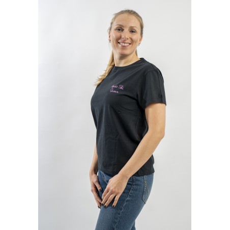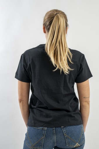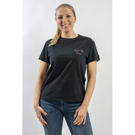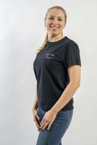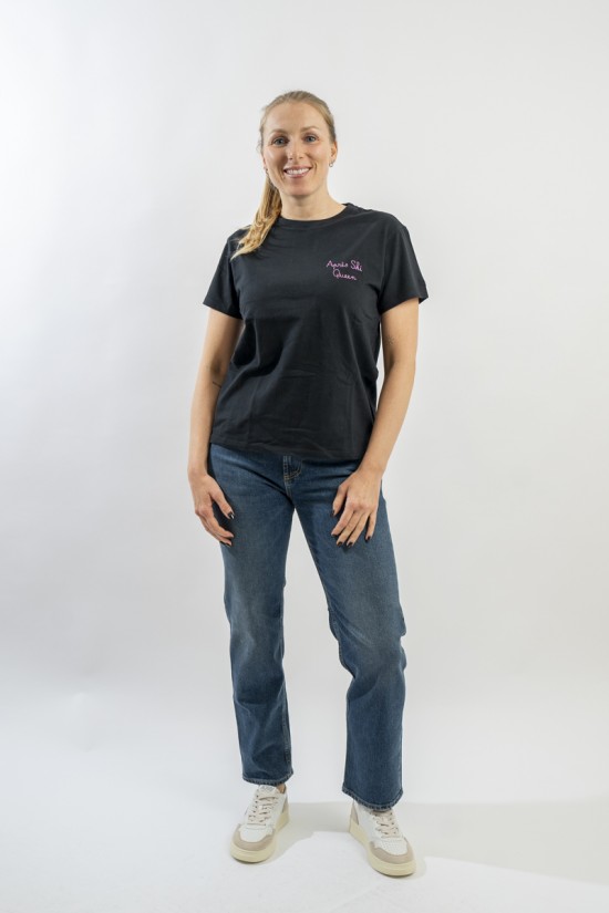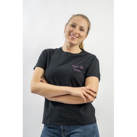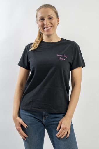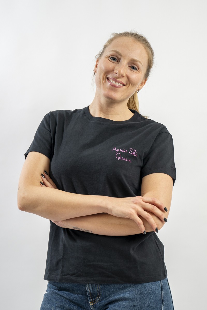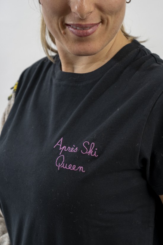 T-shirt girocollo con scollo lavorato a costine. Realizzata in cotone 100% è morbida e confortevole. Arricchita dalla scritta ricamata in filo brillante "Après ski Queen" sul petto.