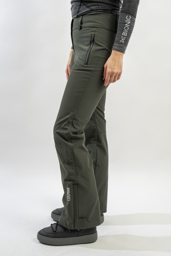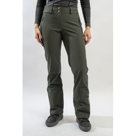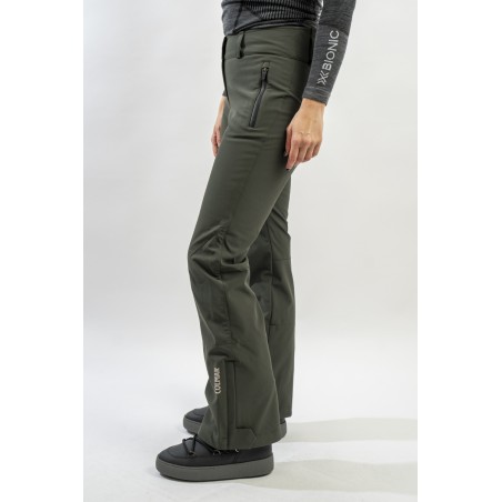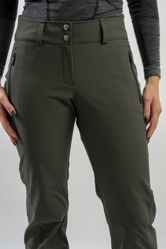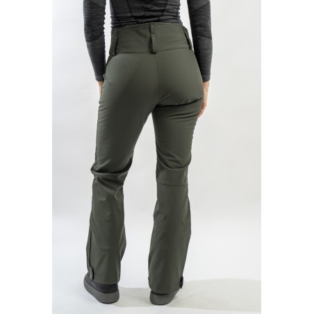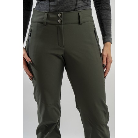Pantalone sci realizzato in tessuto softshell stretch felpato all'interno. Impermeabilie e traspirante. Vestibilità slim e vita alta rinforzata sulla zona lombare. Completa di passanti per la cintura per una miglior adattabilità. Rifinito con ghetta antineve e zip impermeabili, è ottimo sulla neve in ogni condizione.