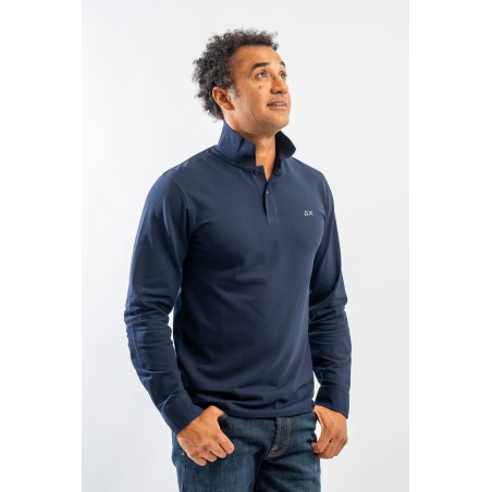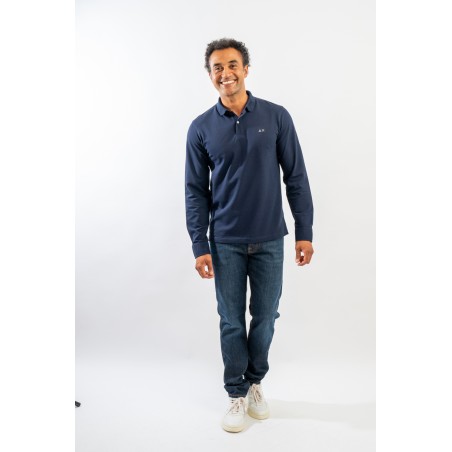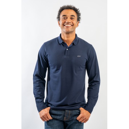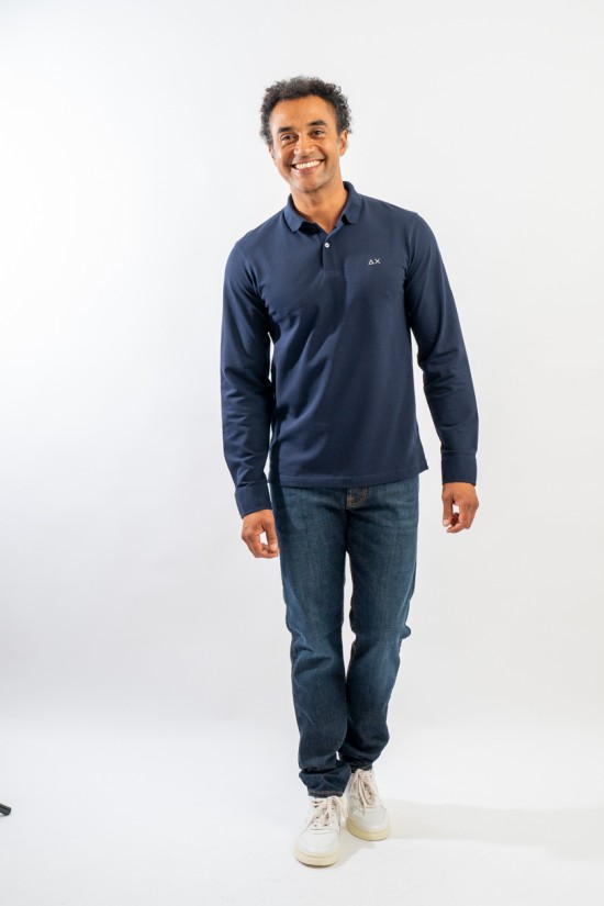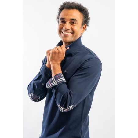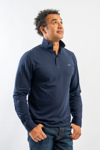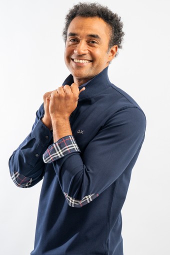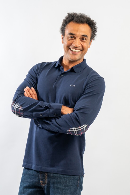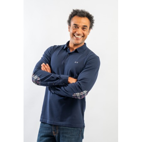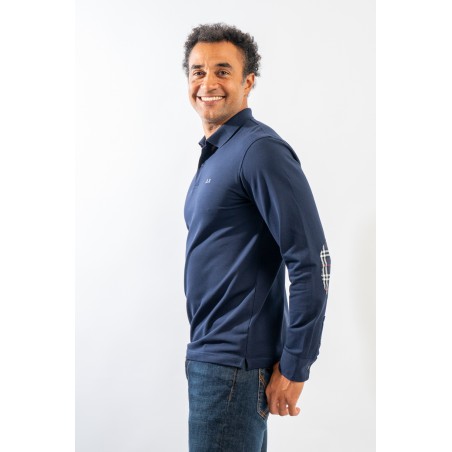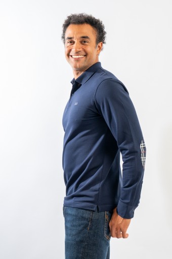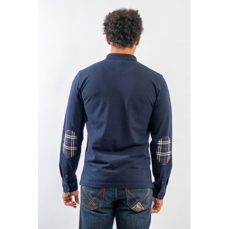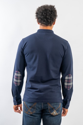 Polo a manica lunga realizzata in cotone con chiusura a 3 bottoni. Polsini camicia con chiusura a due bottoni. Arricchita dal tessuto in fantasia check sui gomiti, effetto toppa, e all'interno dei polsini. Colletto a costine vestibilità regular.