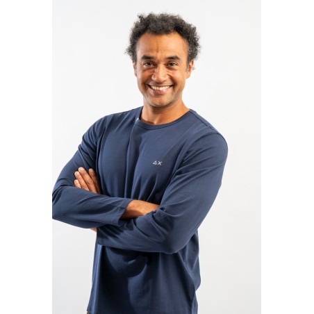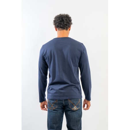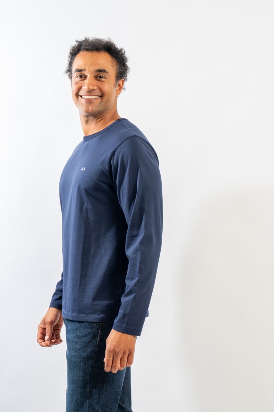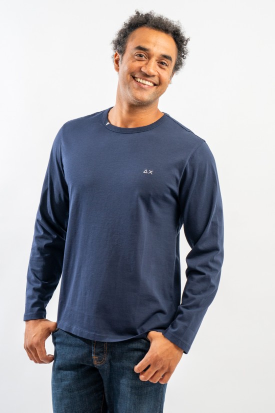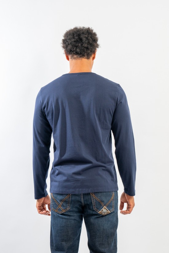 Maglia basica a manica lunga realizzata in cotone. Girocollo con inserto a contrasto lavorato a costine. Vestibilità regular.