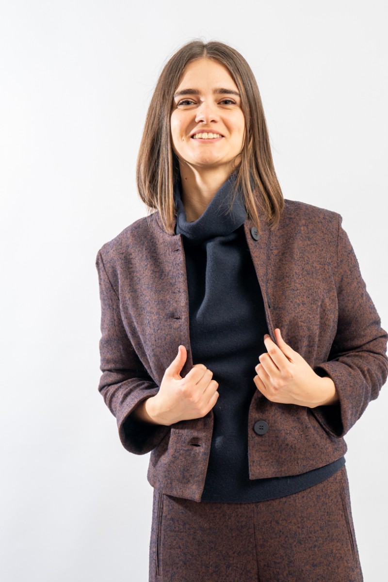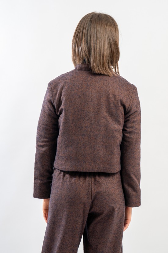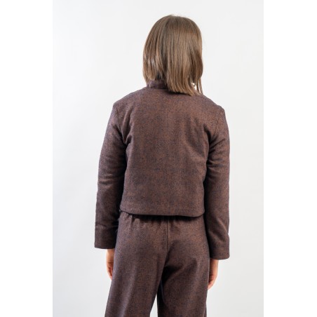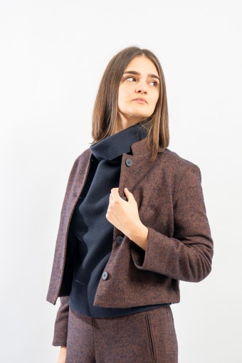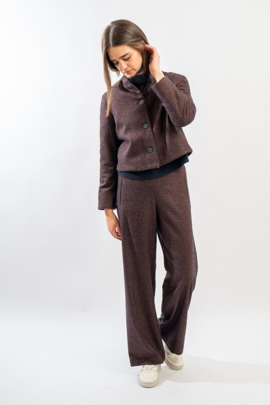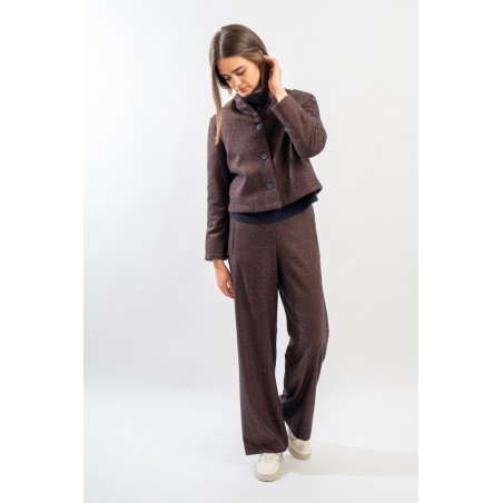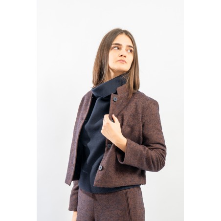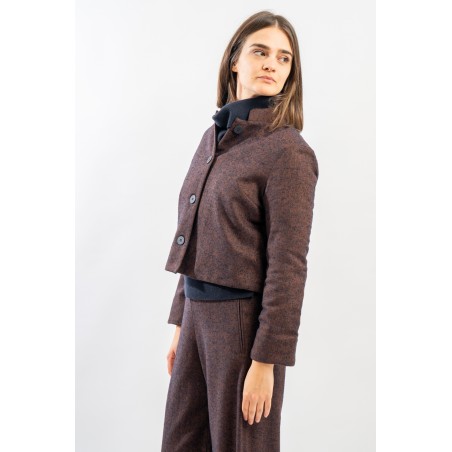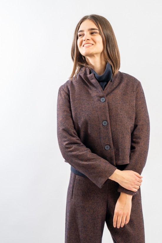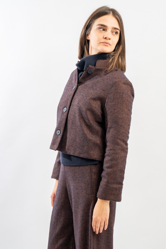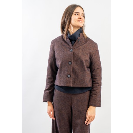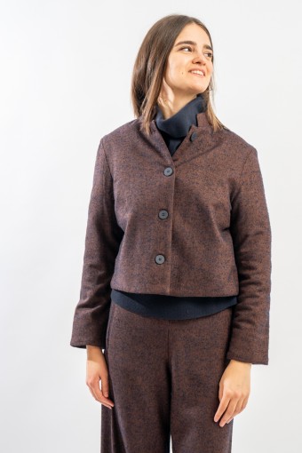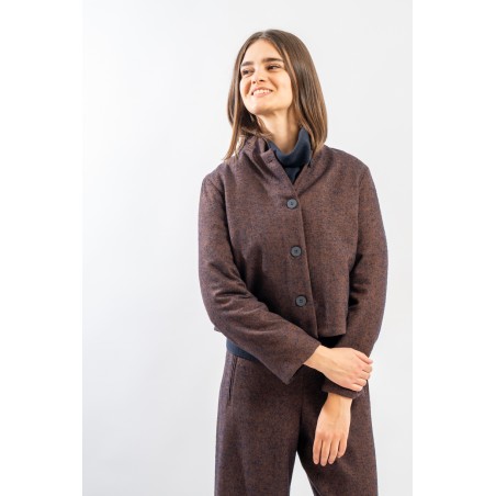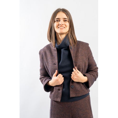Elegante ed esclusivo si presenta il bolerino imbottito firmato Niu. Realizzato in misto lana con stampa a motivo spinato in contrasto di colore. Presenta linee essenziali e taglio sofisticato. Caratterizzato dalla chiusura centrale con bottoni e dal collo alla coreana. Ideale da indossare nella quotidianità o nelle occasioni speciali, abbinato anche al suo pantalone in coordinato.