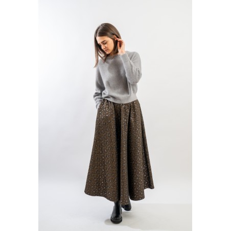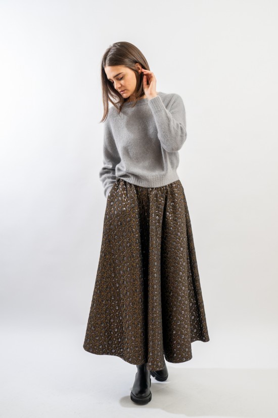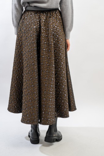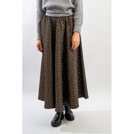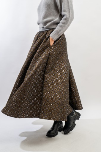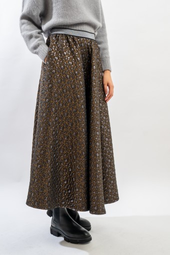 Raffinata gonna lunga realizzata in tessuto jacquard con inserti in lurex, firmata Niu'. Presenta pratico elastico in vita e tasche a filetto laterali. Impreziosita dalla fantasia floreale all over. Perfetta da inodssare con un maglioncino o con il suo bolerino in coordinato.