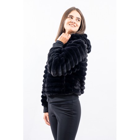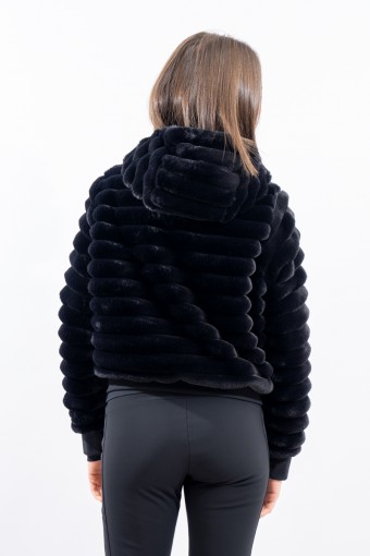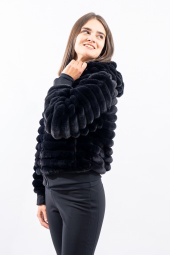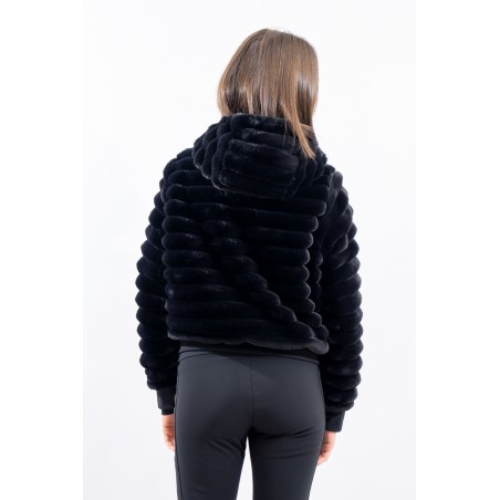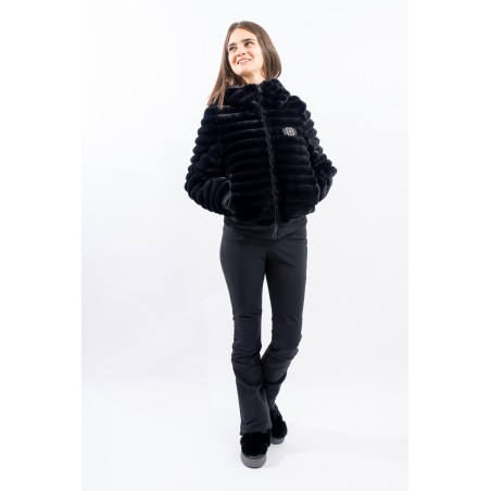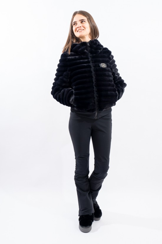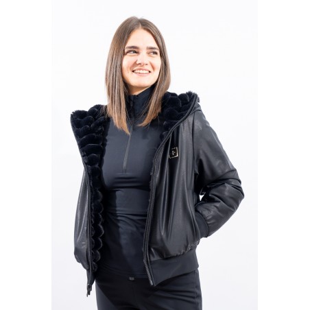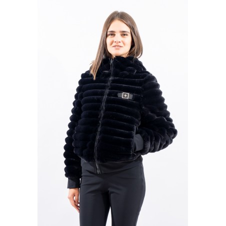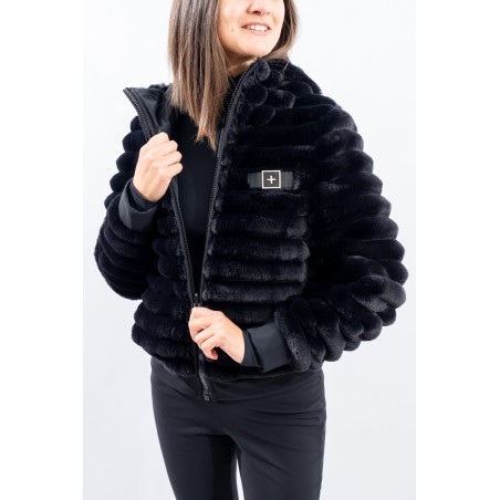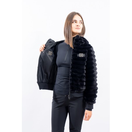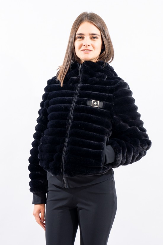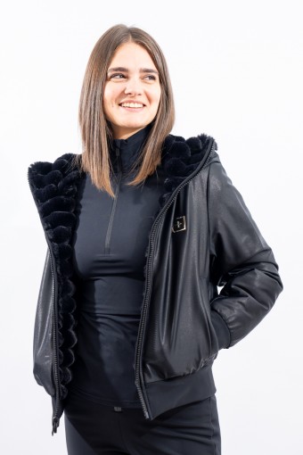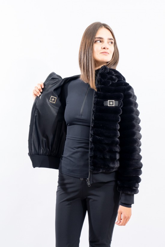 Nata in Alto Adige One More è il risultato della fusione tra sport e natura, si contraddistingue come brand contemporaneo, tecnologico ed ecologico. Il bomber Quattro Sei Uno si contraddistingue per la sua versatilità di utilizzo in quanto double face. Reversibile, può essere utilizzata nel lato in cui è rivestita in morbido ecofur con trapuntatura classica, soffice e sofisticata. Oppure dal lato opposto, dove il look si trasforma in un bomber glitterato satinato, casual e moderno. Dettagli iconici del brand caratterizzano entrambe le versioni per un look sportivo e chic perfettamente adattabile a luogo e condizione.