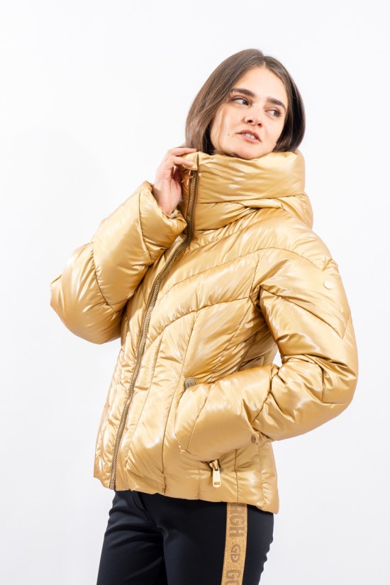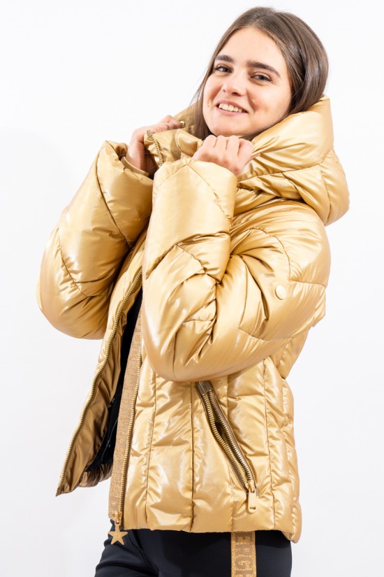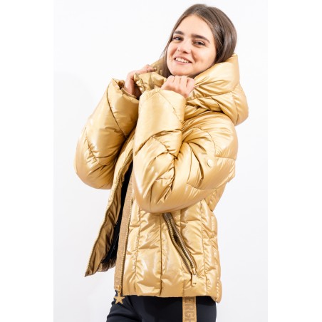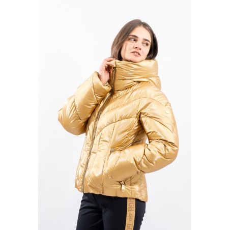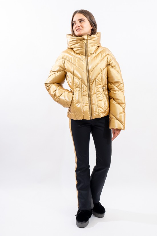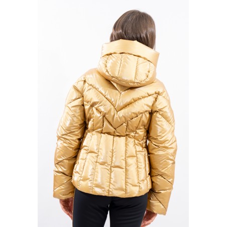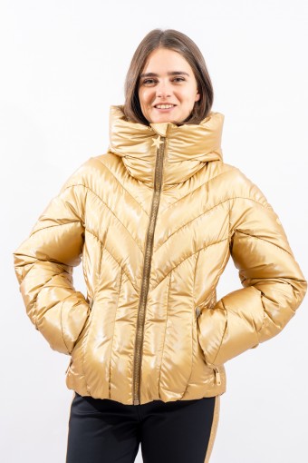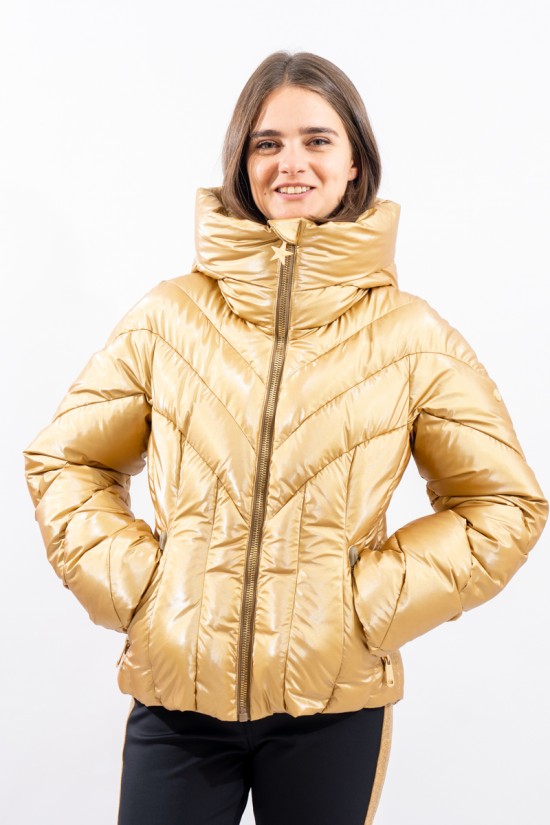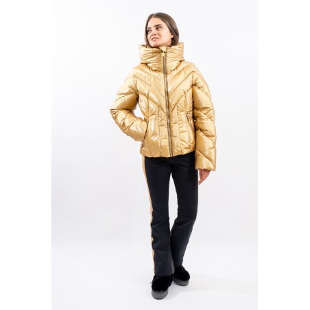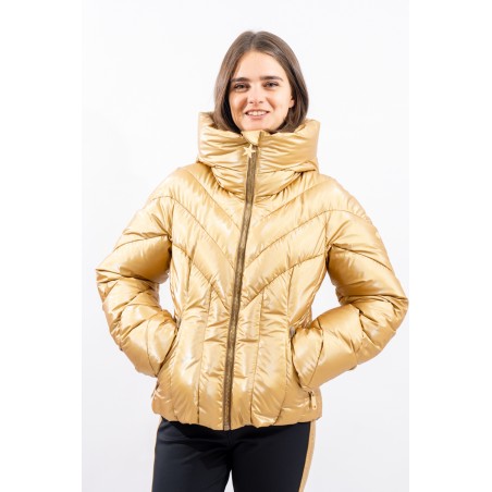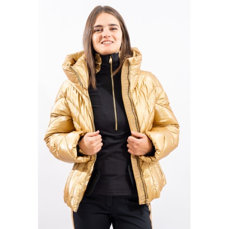Elodie è realizzata in morbido tessuto a base poliuretanica con effetto metallico che vivacizza e risalta i colori. Caratterizzata da una trapuntatura grafica originale che valorizza il punto vita. Le maniche elastiche proteggono maggiormente dall'aria creando maggior aderenza. Calda ed altamente isolante grazie all'imbottitura in piuma. Dotata di ghetta anti neve removibile è versatile, perfetta in montagna come in città.