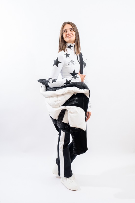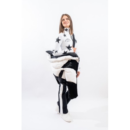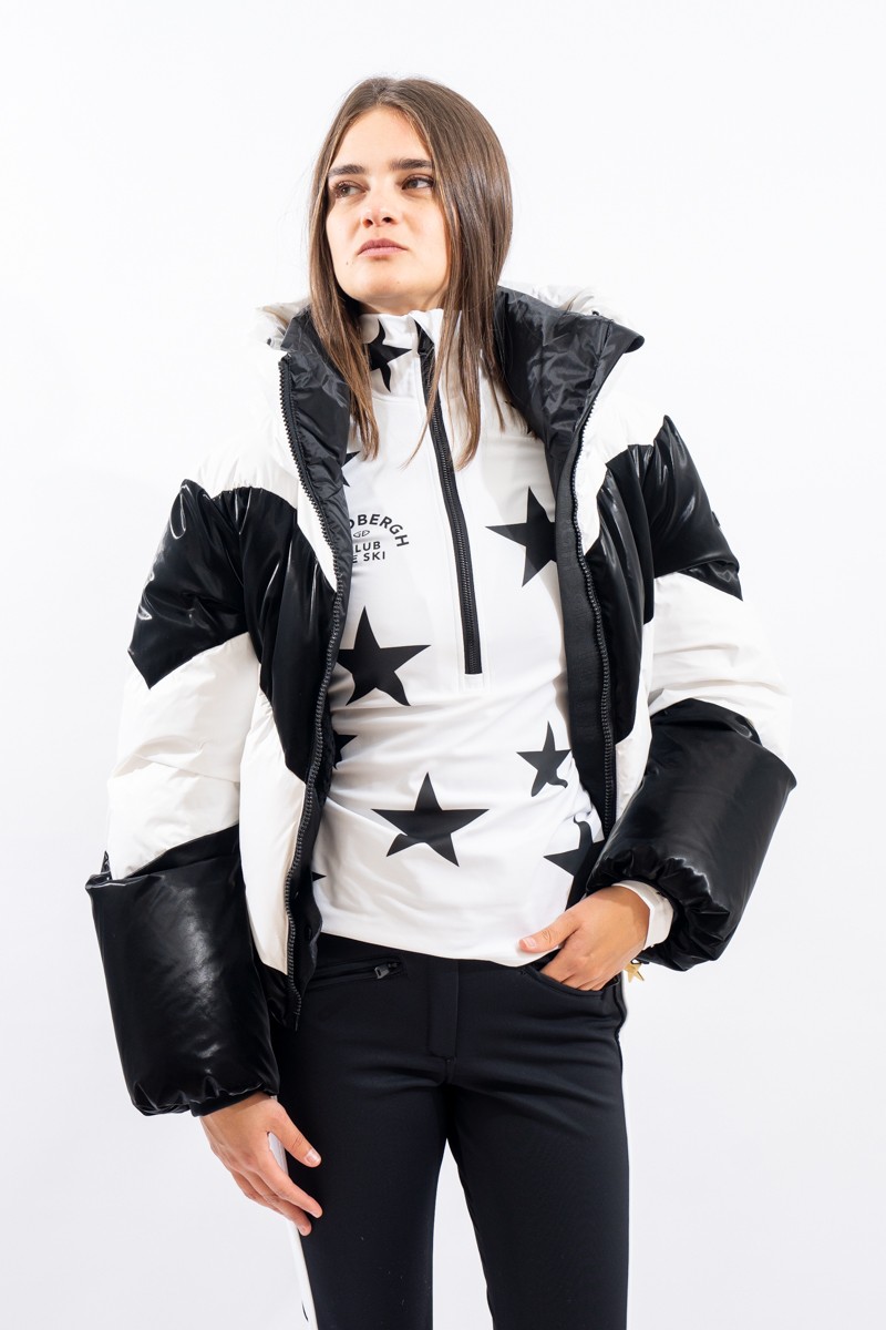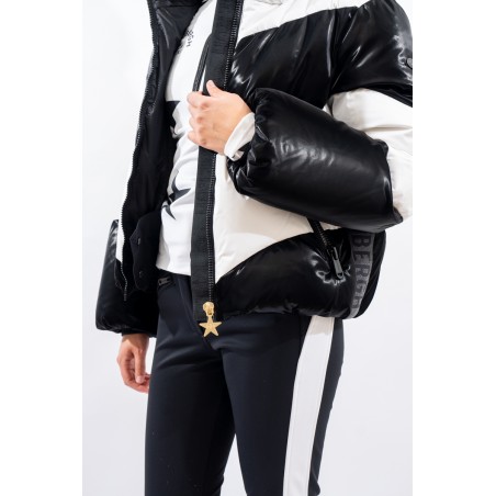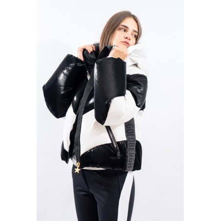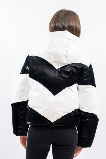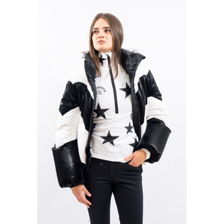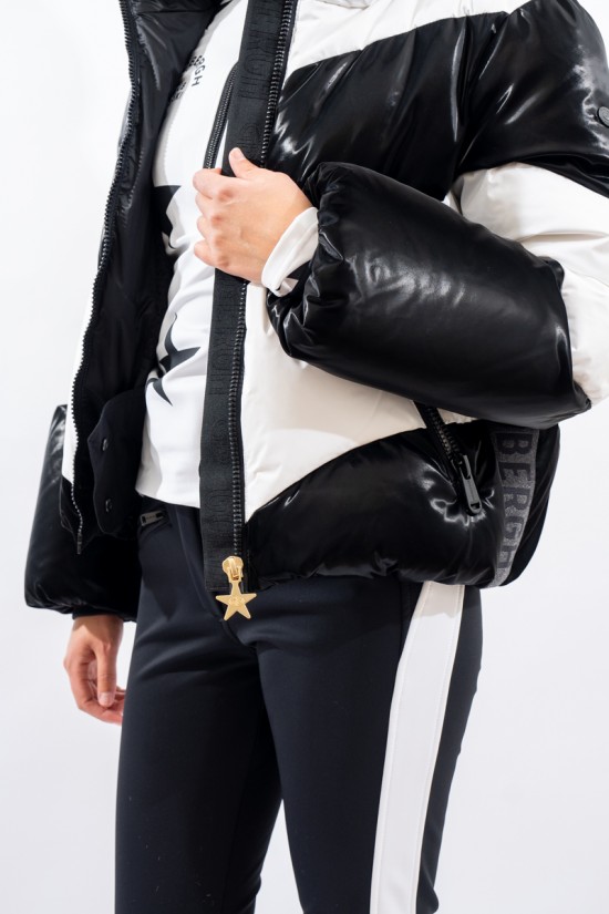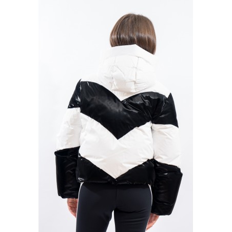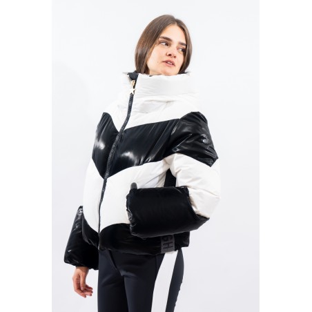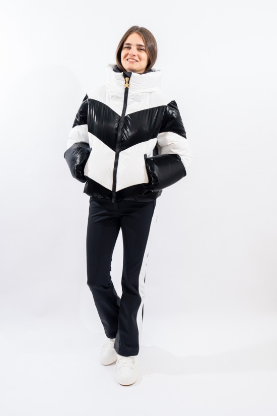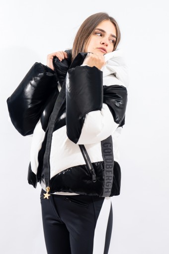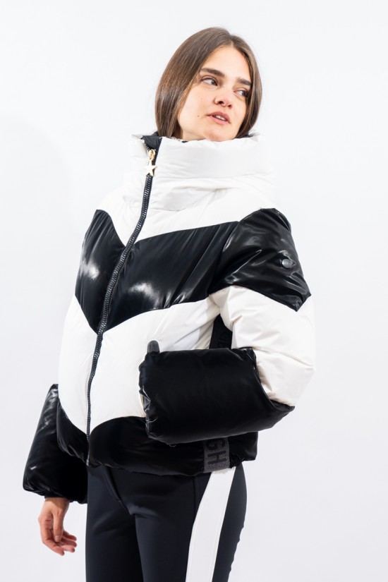 Imbottita in piuma d'oca e caratterizzata da ampi boudine grafici per un effetto puffy giovane e contemporaneo. Il tessuto esterno è dato dall'alternarsi di nylon opaco e nylon lucido che crea un gioco di volumi e di colori che fanno di Courage un capo vivace e divertente. Le maniche imbottite sono complete di polsini anti vento e bordatura elastica per enfatizzare l'effetto desiderato. Versatile e contemporanea è dotata di optional anti neve removibili, per un capo caldo ed avvolgente ideale in montagna sulle piste e non solo.