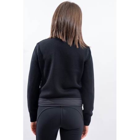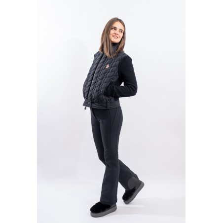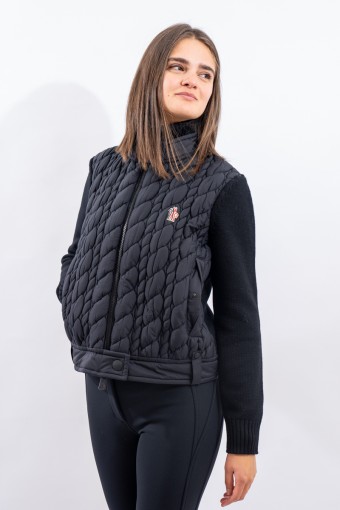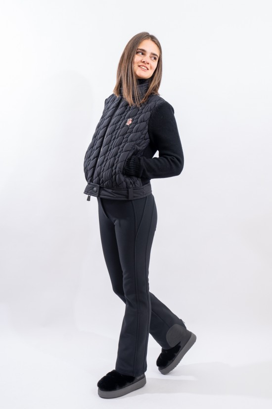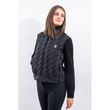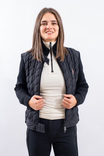 Maglia fullzip realizzata in bimateriale. La parte frontale in nylon, è imbottita in pregiato piumino 90/10, leggero ed isolante, è arricchitta dalla lavorazione con trapuntatura grafica effetto treccia. Il resto del capo, maniche e retro, è in morbida lana vergine, termoregolatore naturale che dona una sensazione di calore aggiuntiva. Collo e polsini sono rifiniti a costa larga. Capo versatile ideale come complemento nelle giornate più miti o come capo aggiuntivo sotto la giacca nelle rigide giornate invernali.