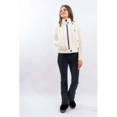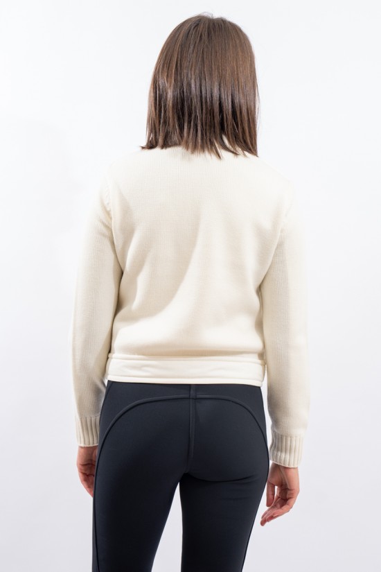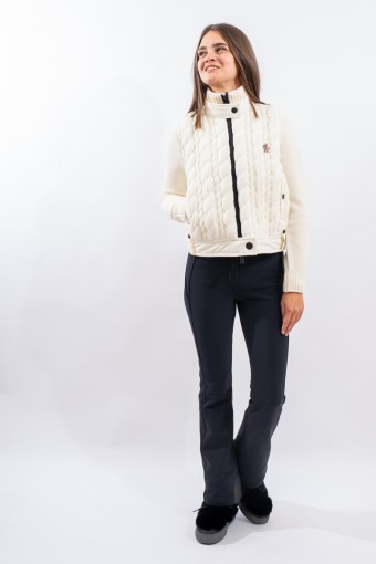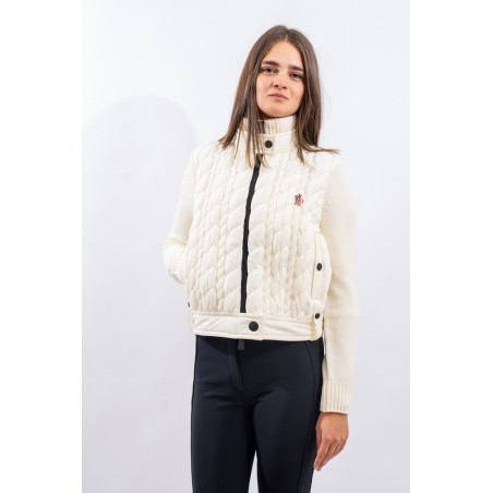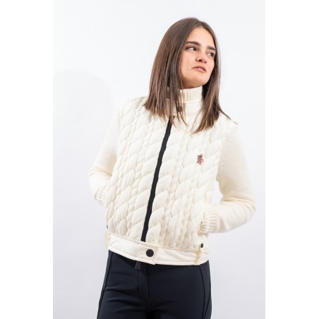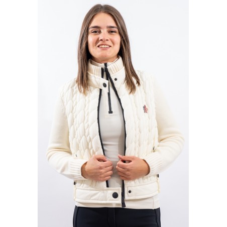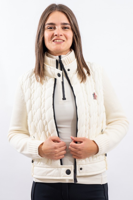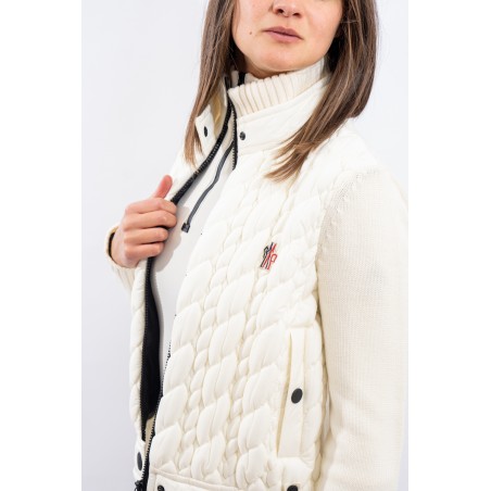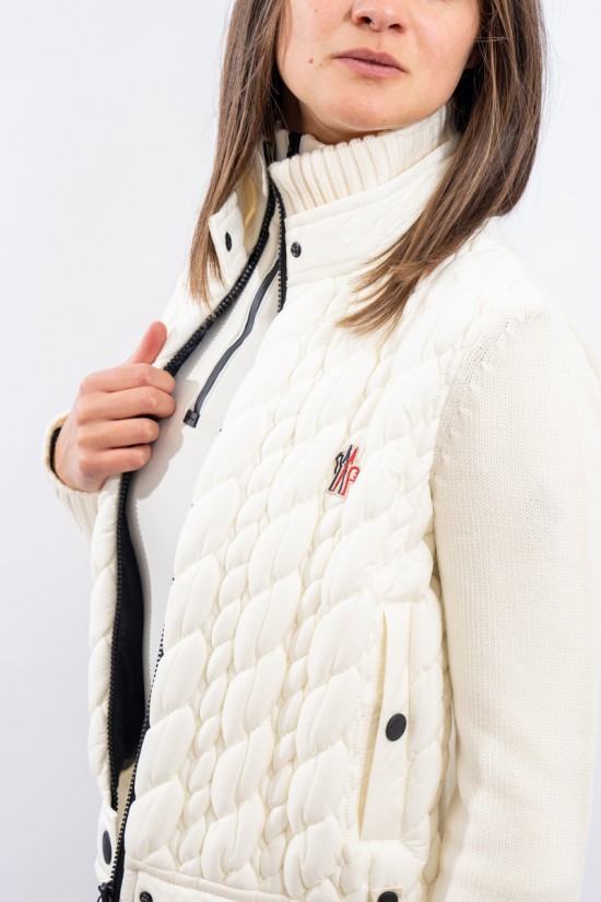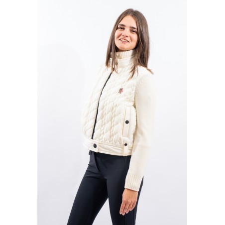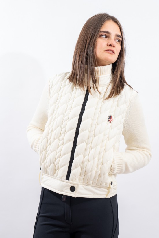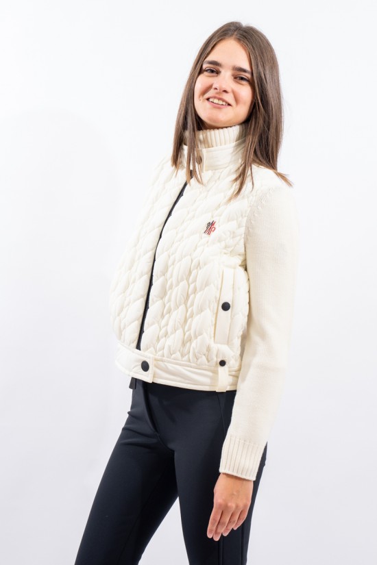 Maglia fullzip realizzata in bimateriale. La parte frontale in nylon, è imbottita in pregiato piumino 90/10, leggero ed isolante, è arricchitta dalla lavorazione con trapuntatura grafica effetto treccia. Il resto del capo, maniche e retro, è in morbida lana vergine, termoregolatore naturale che dona una sensazione di calore aggiuntiva. Collo e polsini sono rifiniti a costa larga. Capo versatile ideale come complemento nelle giornate più miti o come capo aggiuntivo sotto la giacca nelle rigide giornate invernali.