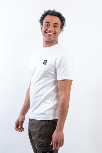T-shirt realizzata in jersey di cotone e tinta in capo firmata Stone Island. Design essenziale arricchito dalle estremità lavorate a costine ed impresiosite dalla cucitura tridimensionale. Completa il look l'applicazione dell'iconico badge Compass Stone Island sul petto.