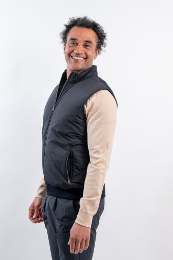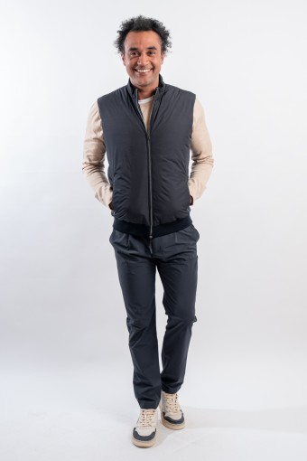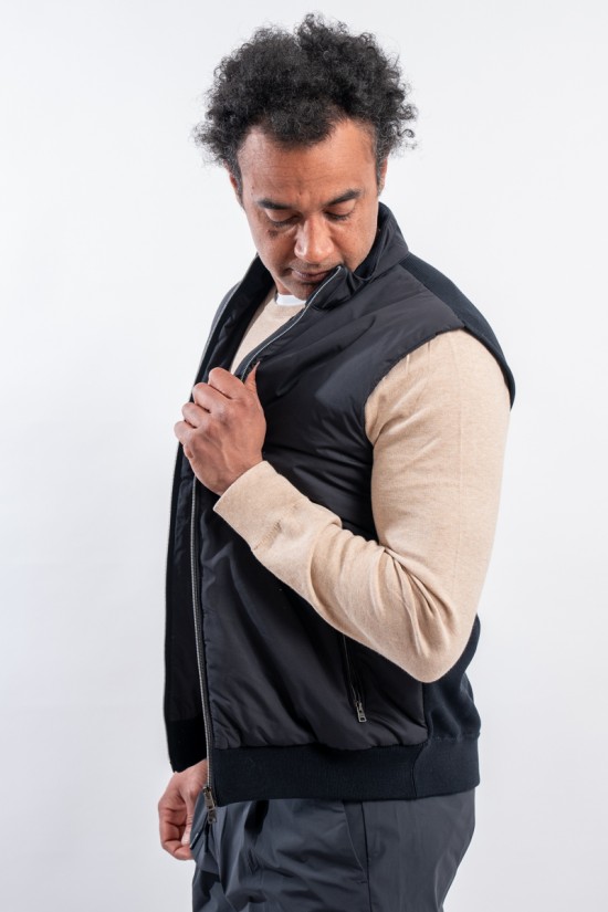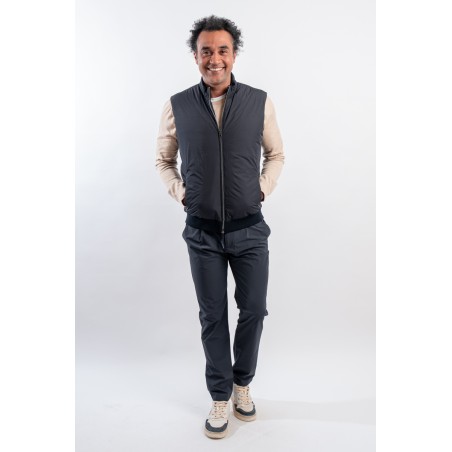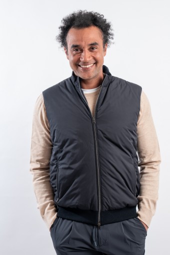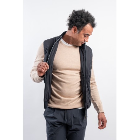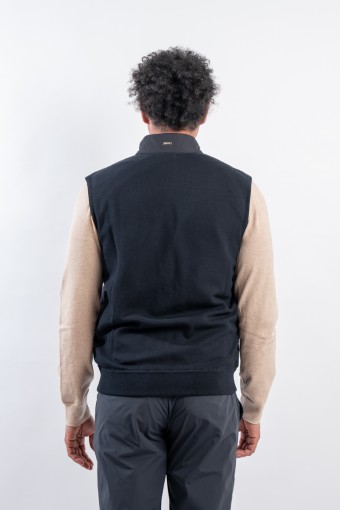 Smanicato realizzato in misto cotone e poliestere. La parte frontale è leggermente imbottita in morbida ovatta, il retro in cotone, presenta un'elegante lavorazione a maglia stretta. Il fondo è rifinito da una fascia a costine elasticizzate per una maggiore aderenza. Versatile e sofisticato può essere indossato in varie modalità, è capo indispensabile per affrontare al meglio e con classe, il passaggio di stagione.