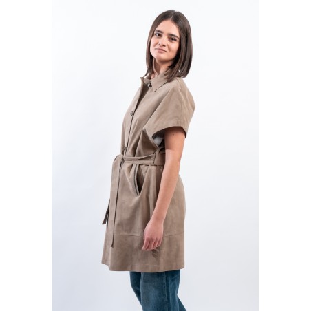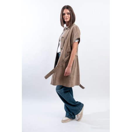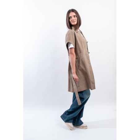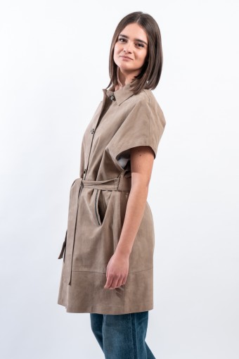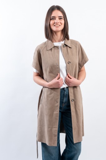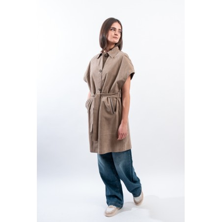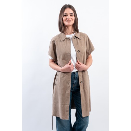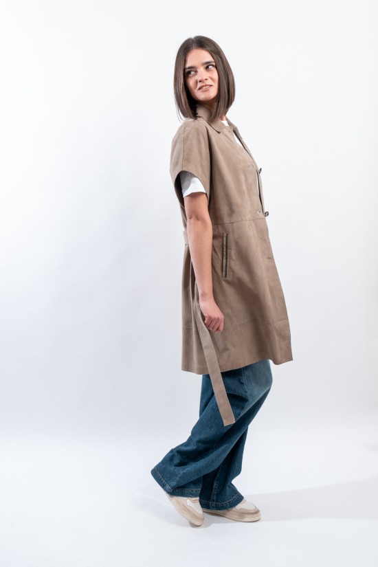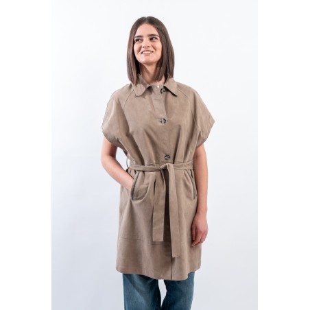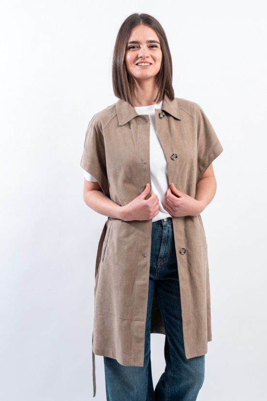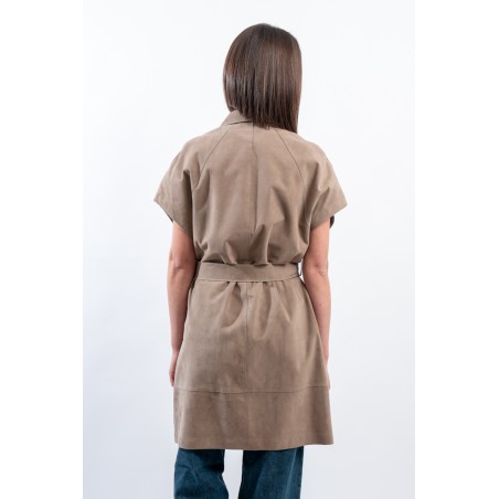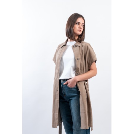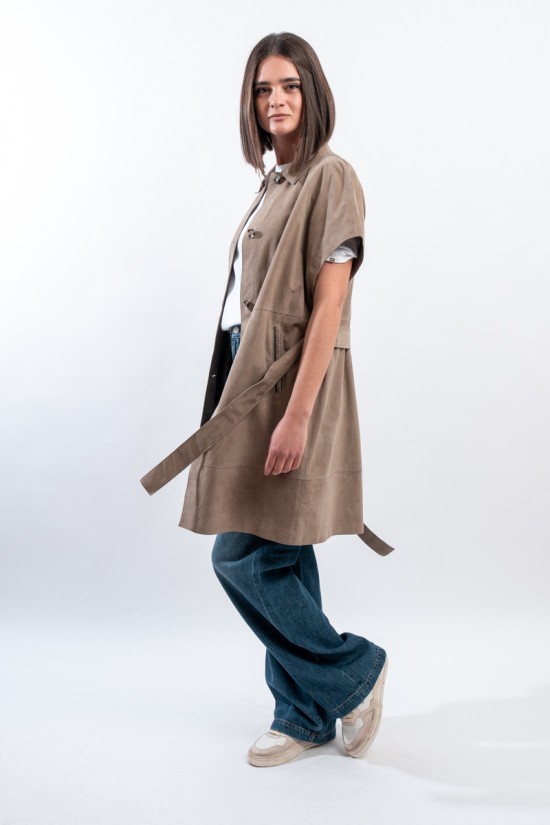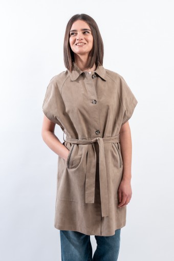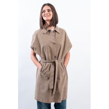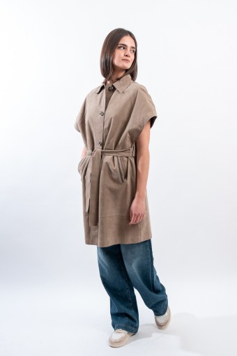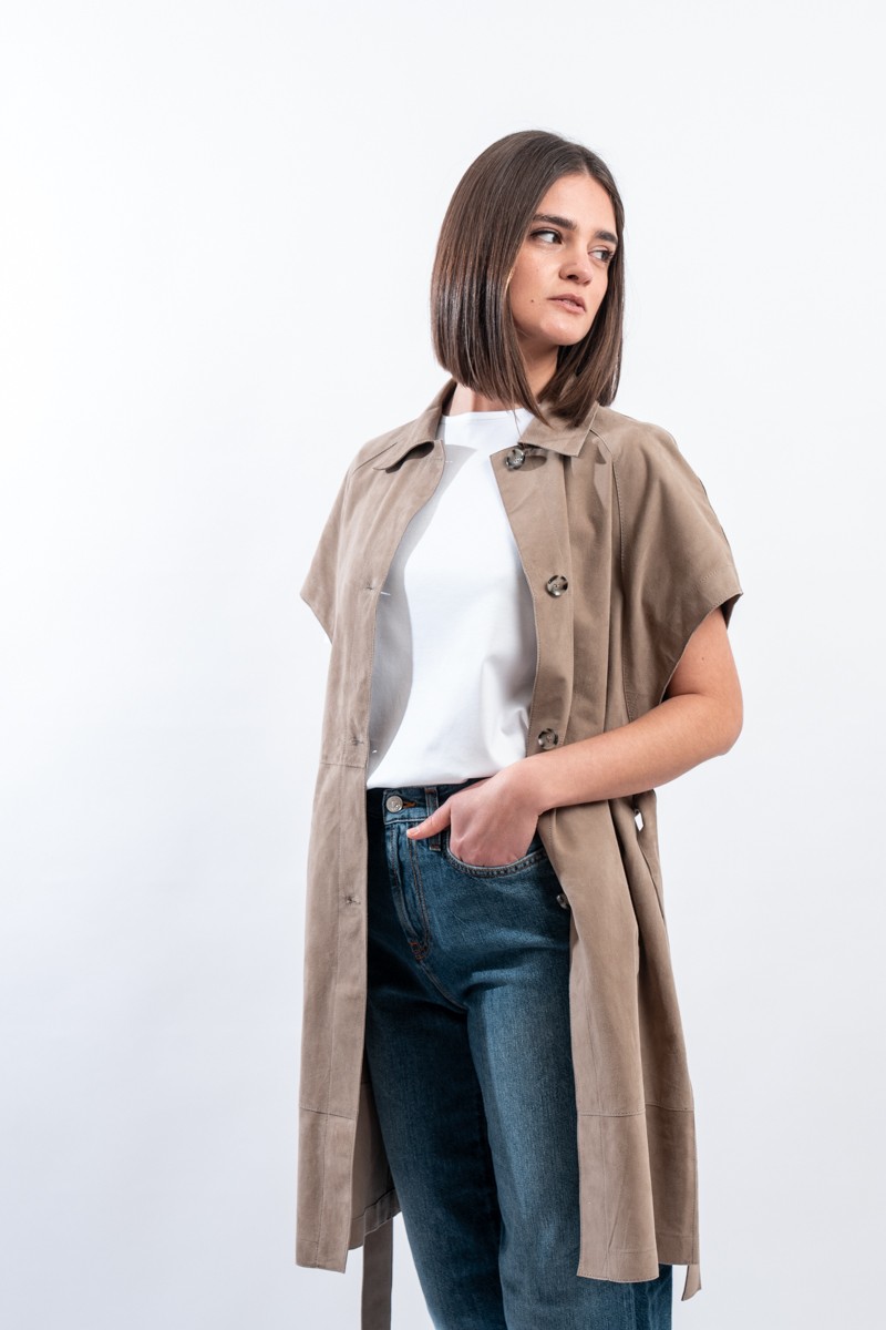Il trench smanicato in suede super light completamente sfoderato è il capo perfetto per spalancare le porte alla primavera! Lunghezza media senza maniche con cintura. Chiusura principale con bottoni tono su tono a vista. Dotata di due tasche laterali oblique con preziosa bordatura effetto perlato. Il trattamento interno effetto perlizzato rifinisce il capo anche internamente.