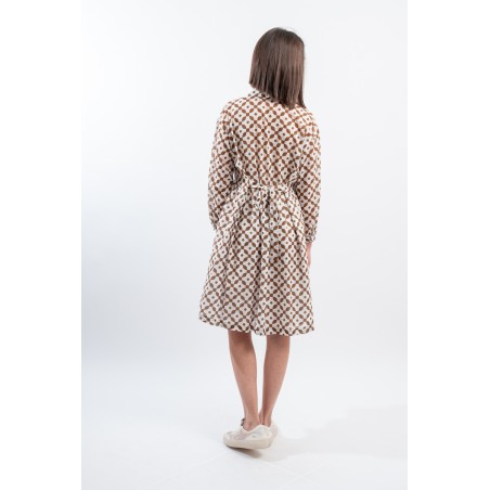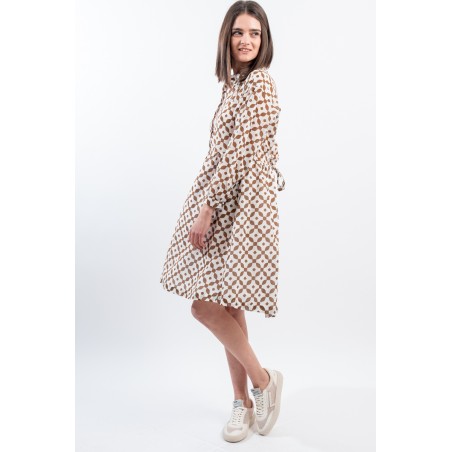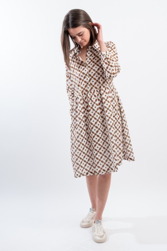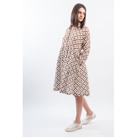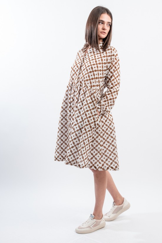 Abito a tulipano in micro fantasia realizzato in leggerissimo voile di cotone. L'abito ha un taglio aderente al busto e alla vita, con una gonna che si apre sui fianchi. Collo a camicia e bottoncini sul davanti, cinturina in tessuto sul retro.