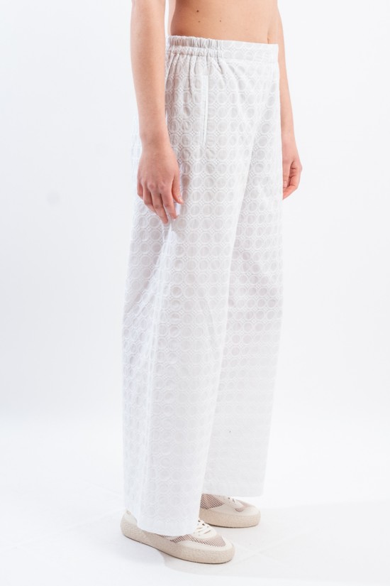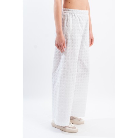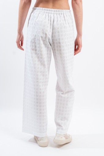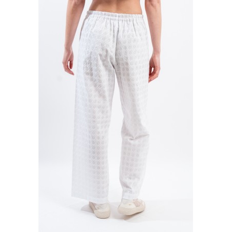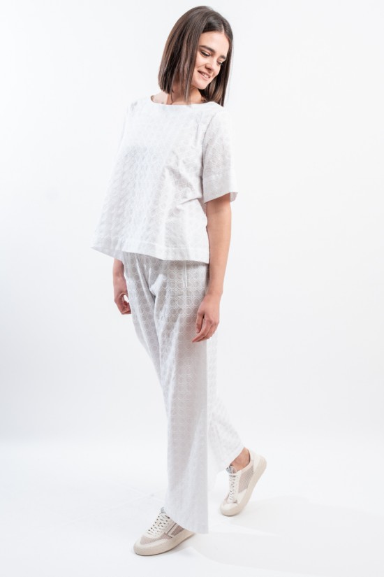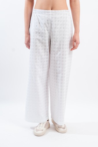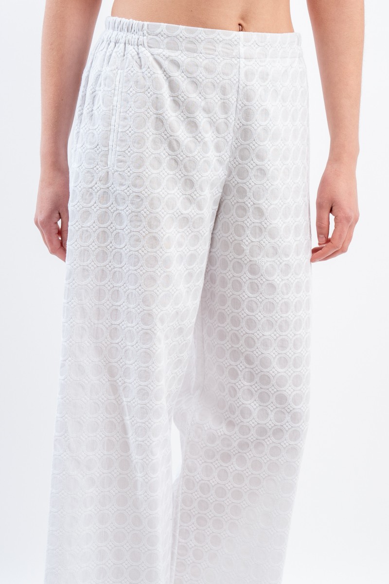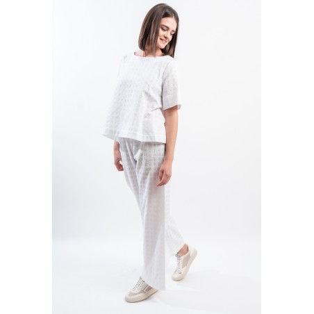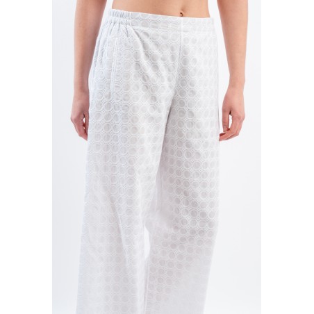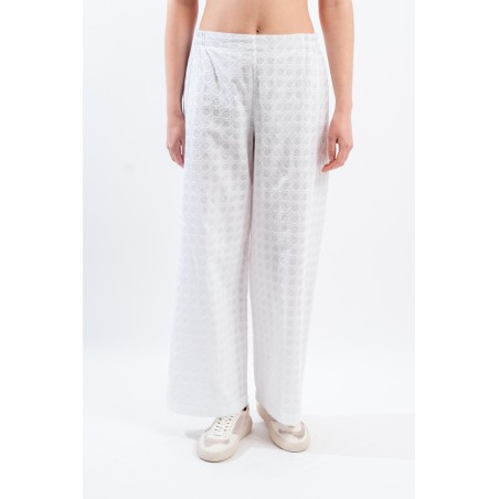 Il pantalone iconico della linea NIU è particolarmente apprezzato per la sua linea fluida adatto a vestire ogni donna. L'inserto in vita elasticizzato sul retro lo rende estremamente comodo. Realizzato in cotone con motivo ricamato in rilievo diventa raffinato ed elegante, adatto anche alle occasioni più speciali. Gamba dritta e tasche a filetto sul davanti.