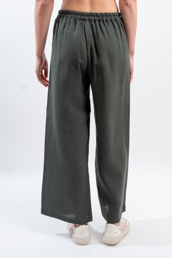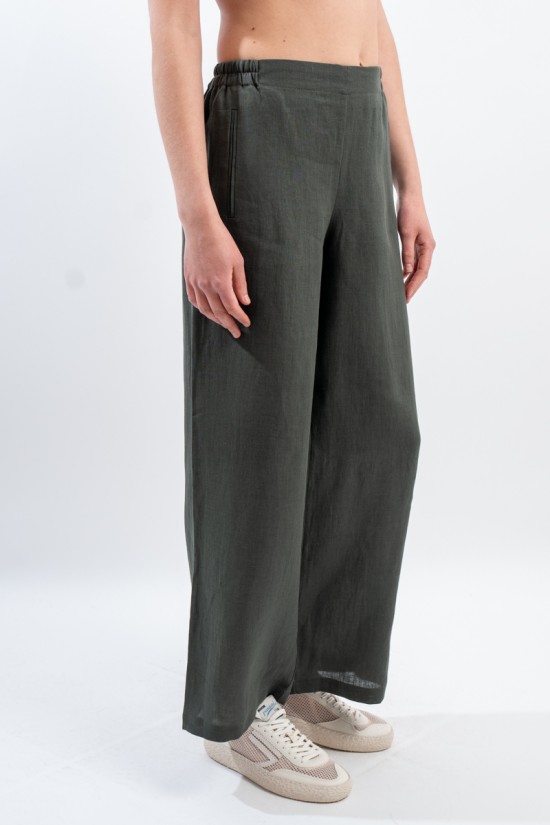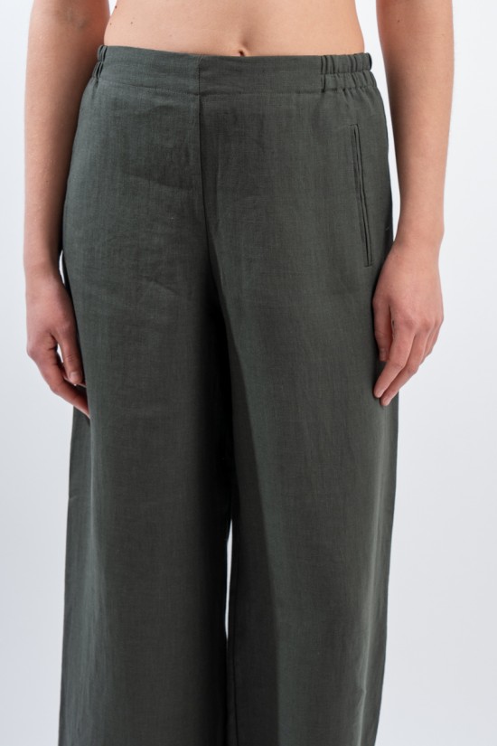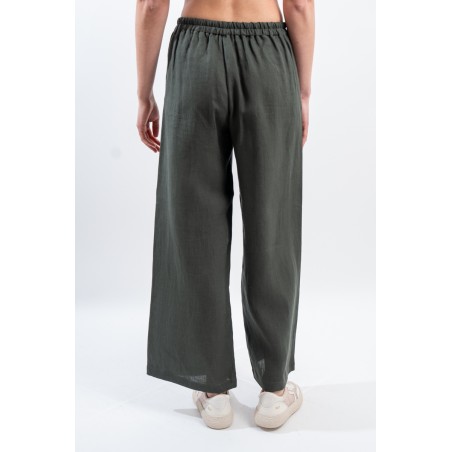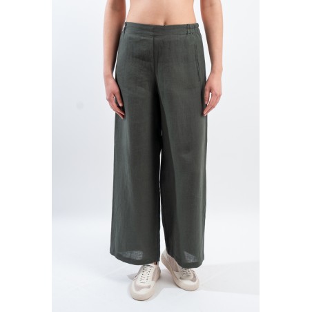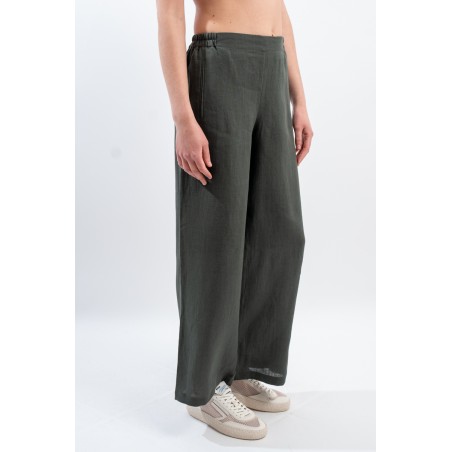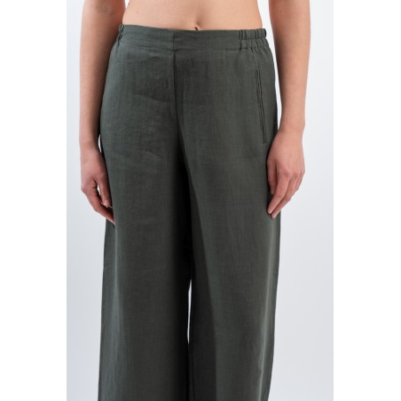 Il pantalone iconico della linea NIU è particolarmente apprezzato per la sua linea fluida adatto a vestire ogni donna. L'inserto in vita elasticizzato sul retro lo rende estremamente comodo. Realizzato in lino risulta morbido al tatto, fresco e confortevole. Gamba dritta e tasche a filetto sul davanti.