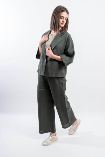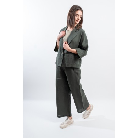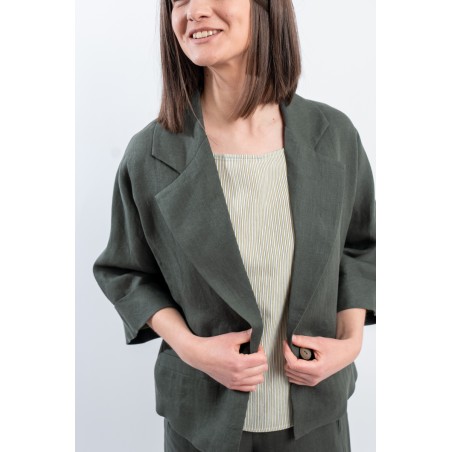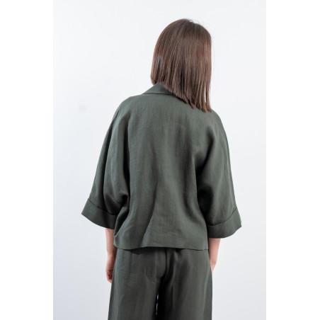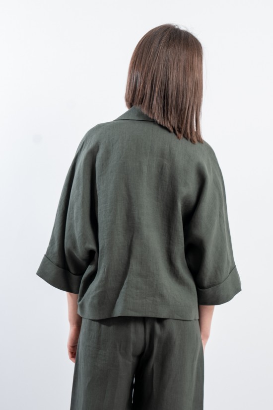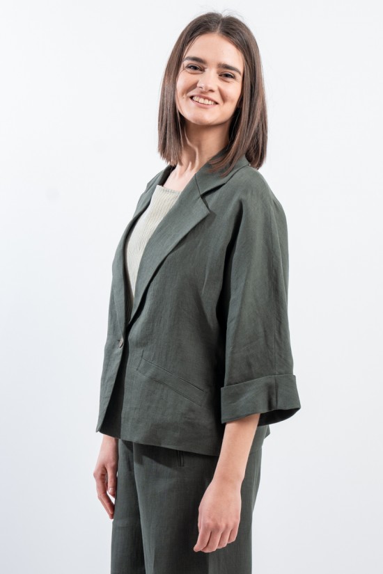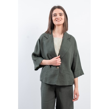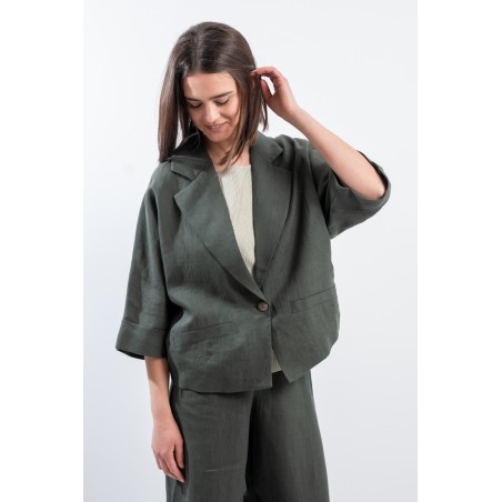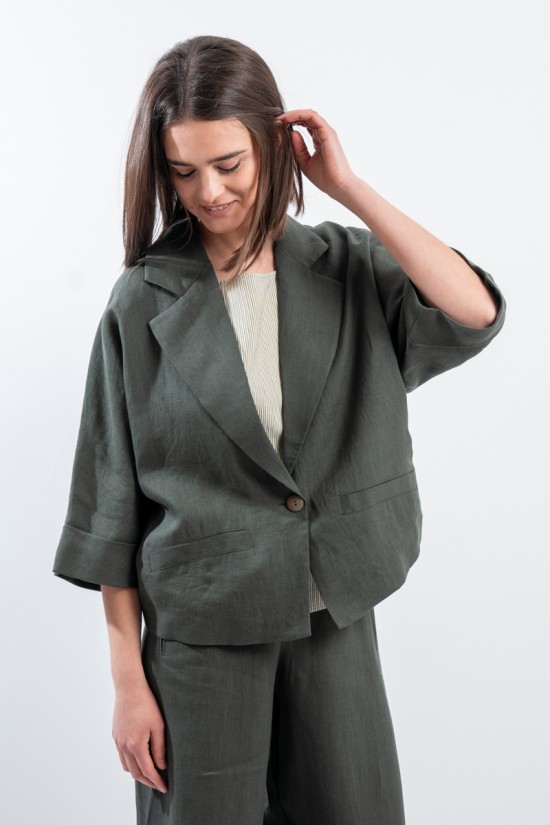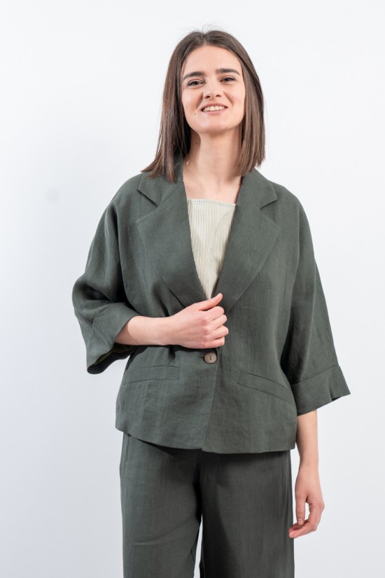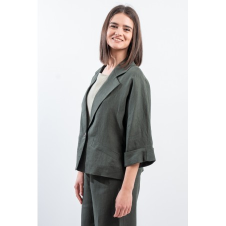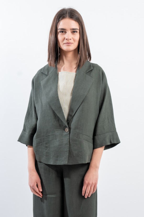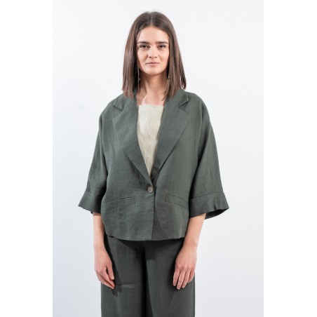 Giacca kimono dalla vestibilità over. Collo a revers, spalla scesa e manica 3/4 con risvolto sul fondo. Taglio corto e chiusura con un bottone centrale. Fodera interna a contrasto di colore. Un capo originale e di grande effetto!