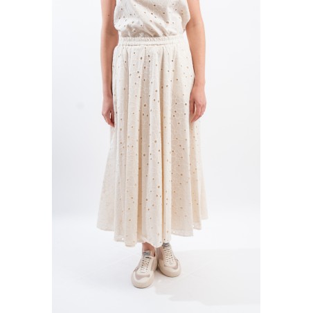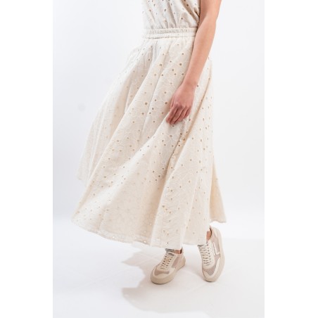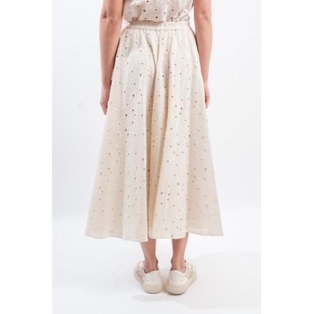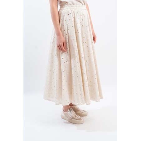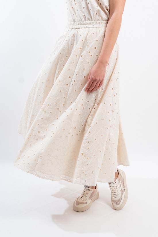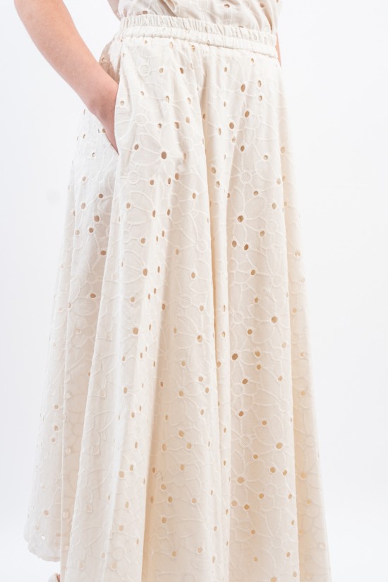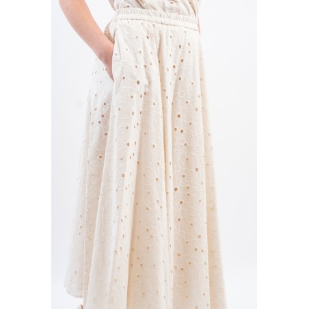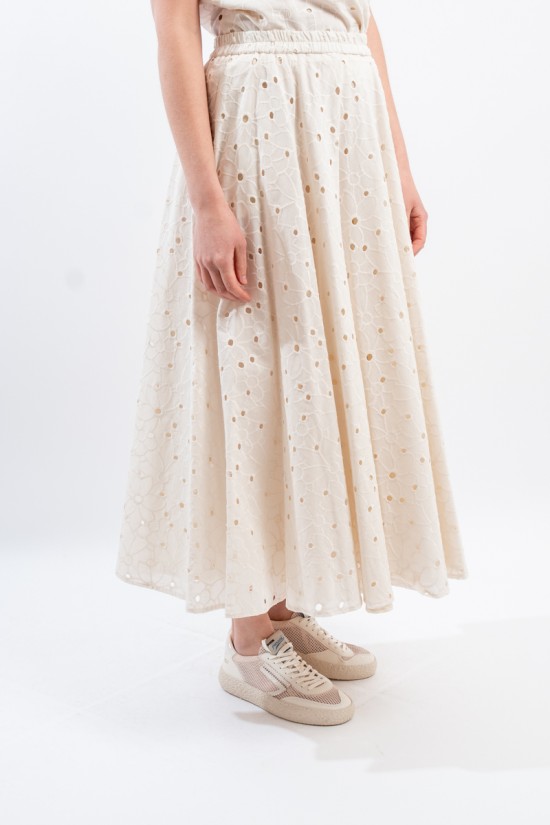 Fresco e confortevole si presenta il gonnellone lungo a ruota, realizzato in cotone. Caratterizzato dal punto vita elasticizzato, dal tessuto sangallo e da due tasche laterali aperte. Una maxi gonna pensata per accompagnarti in ogni situazione grazie alla sua essenzialità e alla sua raffinatezza.