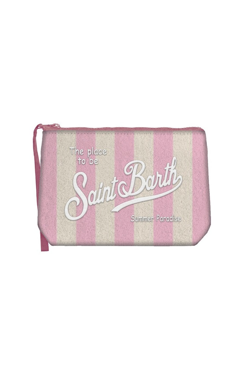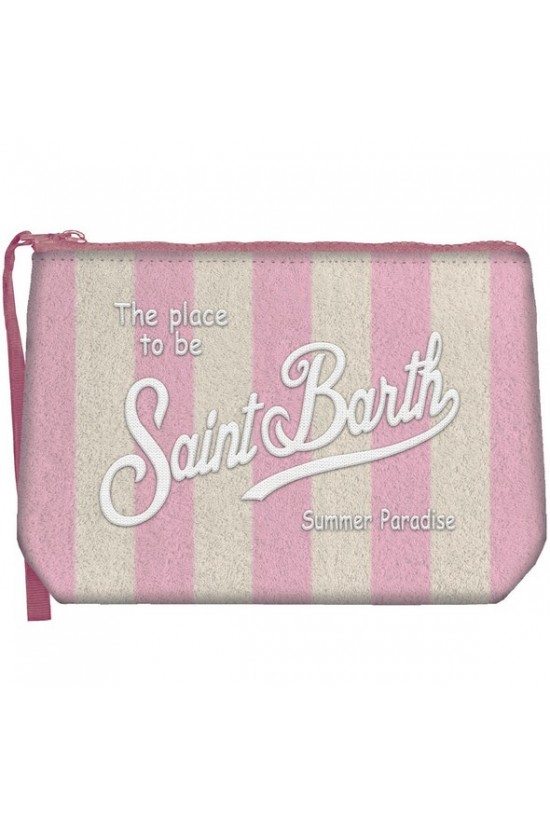 Pochette Aline di Saint Barth realizzata in morbido tessuto spugna "Terry Collection". Impreziosita dal motivo a righe e logo Saint Barth cucito in rilievo e a contrasto di colore. Chiusura con zip e passante per polso in gros-grain. Ottima sia per la spiaggia che per la città, si abbina ai costumi da bagno e alle borse Saint Barth.