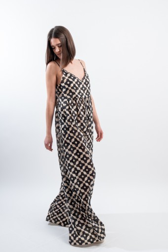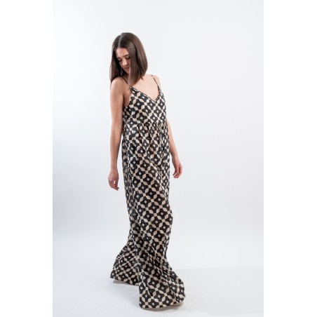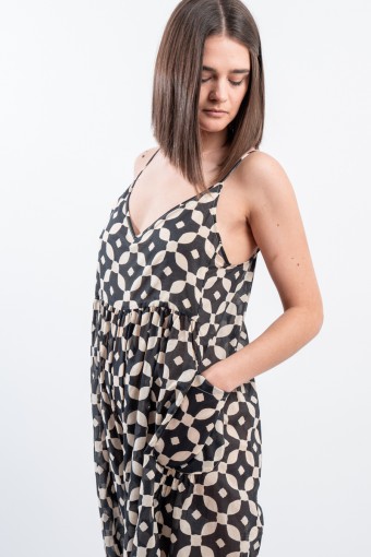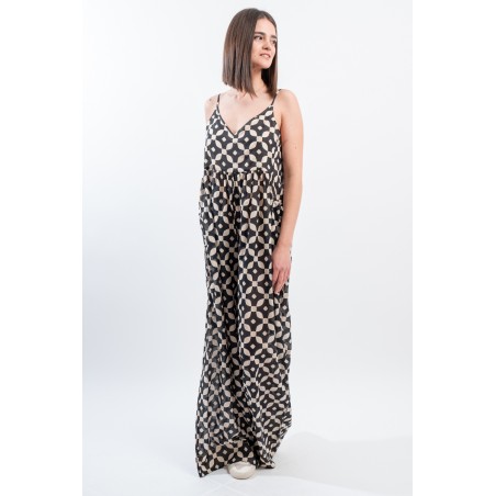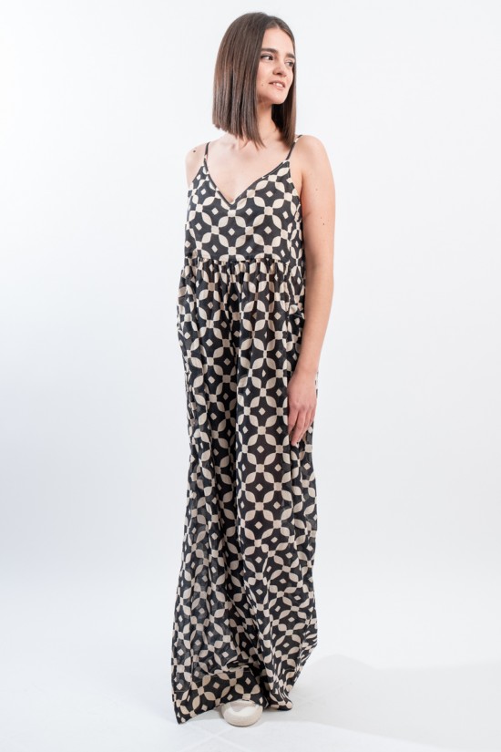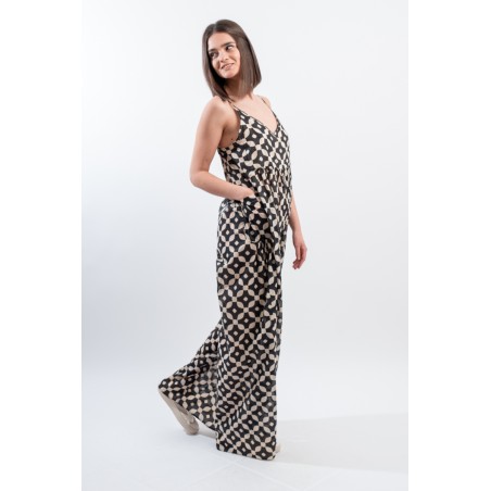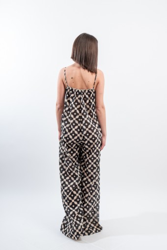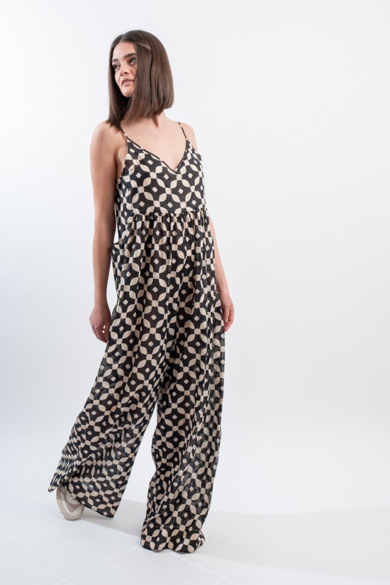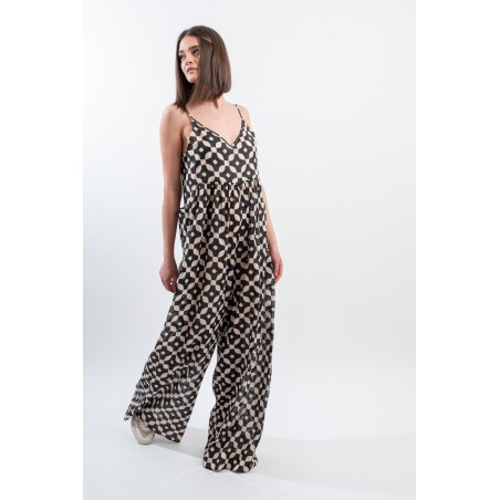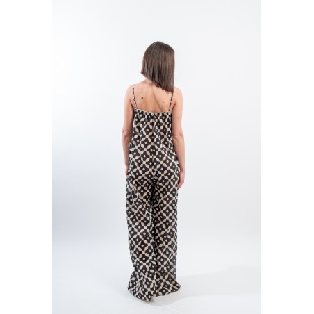 Fresco e ricercato il tutone ampio in fantasia black&white realizzato in una leggera mussola di cotone. Spalline sottili e regolabili, scollo a V e arricciattura sul davanti. L' ampio pantalone diritto a palazzo valorizza questo look elegante e dinamico. Perfetto da indossare durante occasioni speciali o nelle calde serate estive!