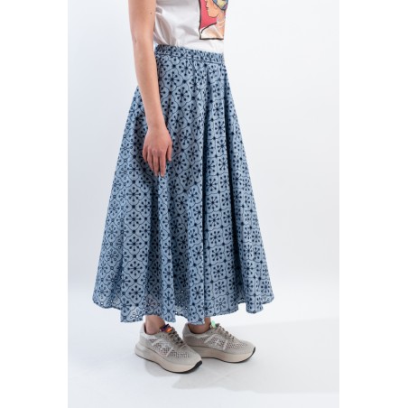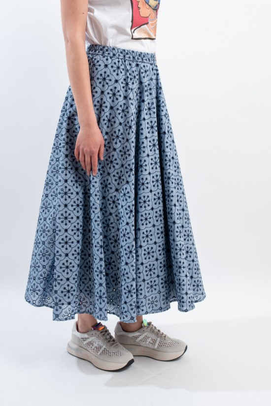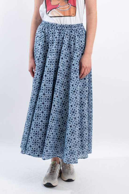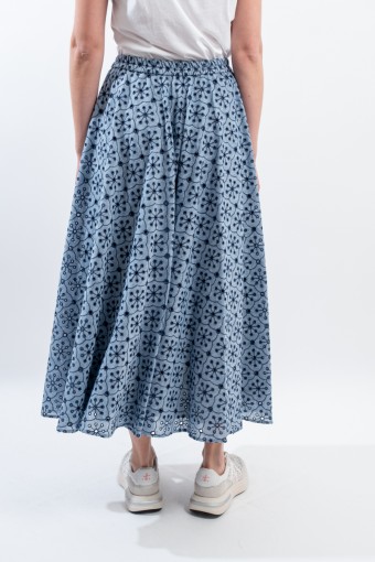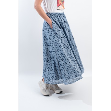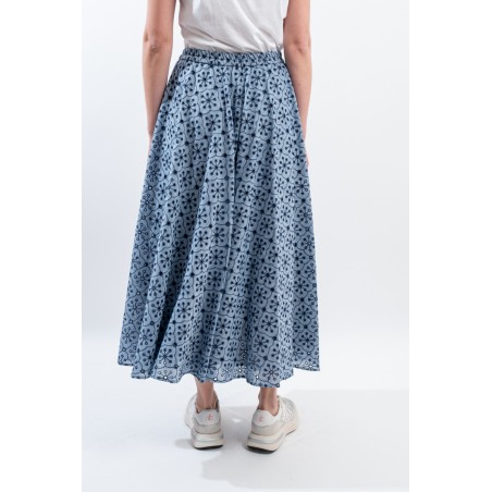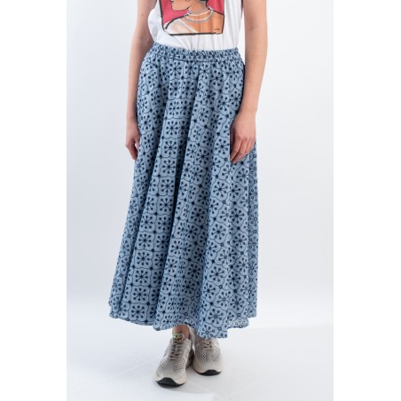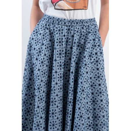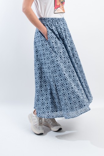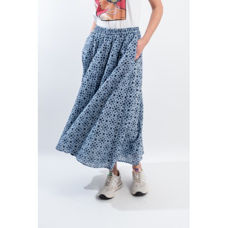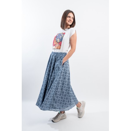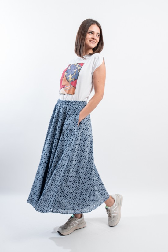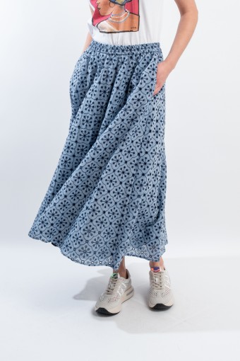 Fresco e confortevole si presenta il gonnellone lungo a ruota, realizzato in cotone effetto denim con ricamo a contrasto. Caratterizzato dal punto vita elasticizzato, dal tessuto sangallo e da due tasche laterali aperte. Una maxi gonna pensata per accompagnarti in ogni situazione grazie alla sua essenzialità e alla sua raffinatezza.