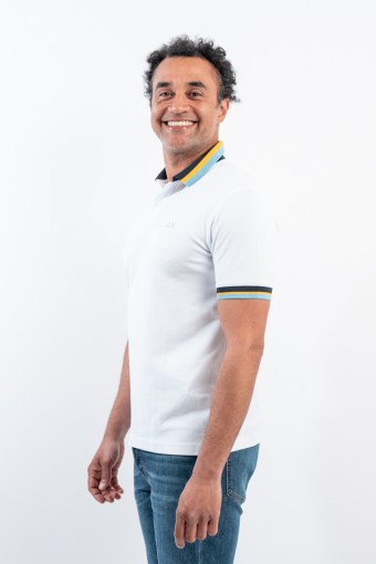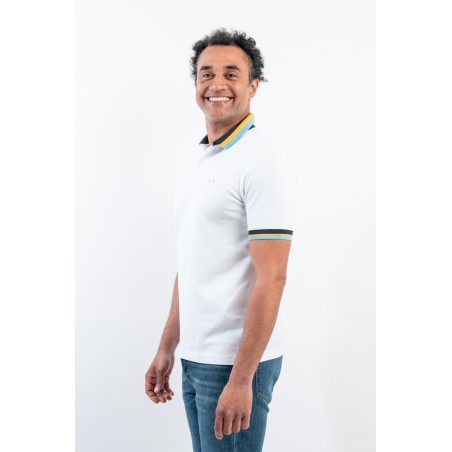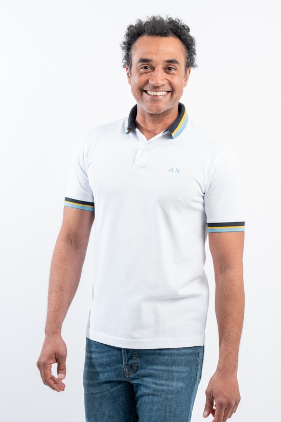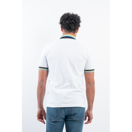 Polo 2 bottoni a manica corta realizzata in piqué stretch. Spacchi laterali sul fondo. Colletto e bordo maniche a micro costine. Caratterizzata da colori vivaci con profili multicolori a contrasto. Logo ricamato sul petto. Slim fit.