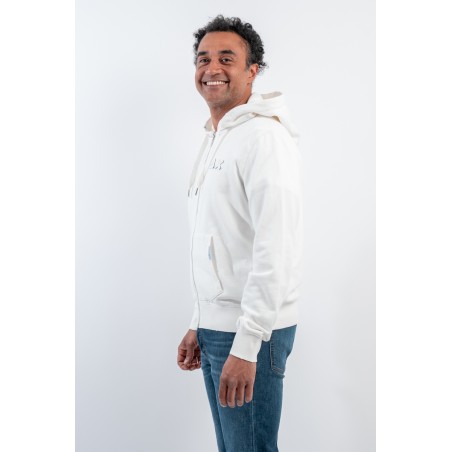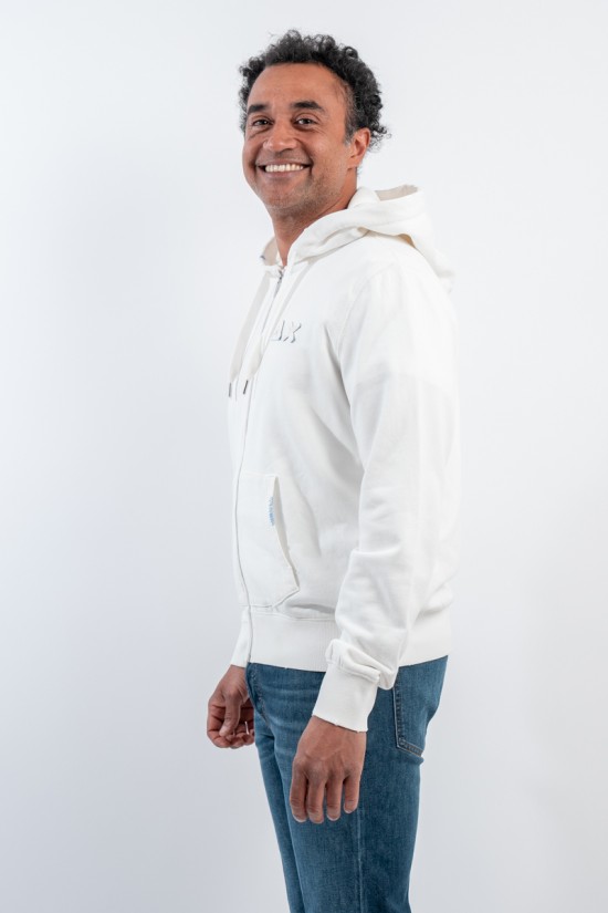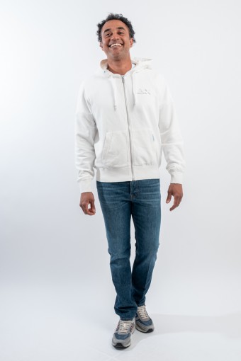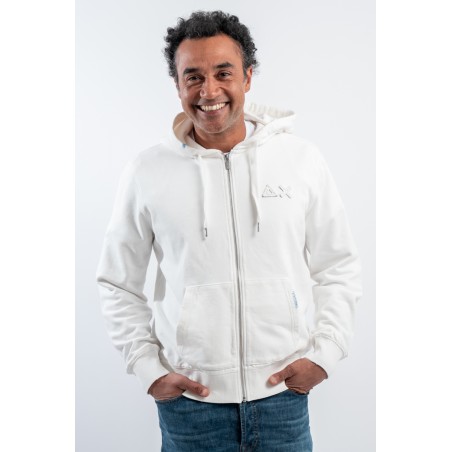 Felpa in cotone elasticizzato con cerniera. Caratterizzata dal logo ricamato con Patch SUN68 tono su tono sul petto. Con cappuccio e coulisse di regolazione. Maniche e fondo a costine. Tasche a marsupio con dettaglio in contrasto.