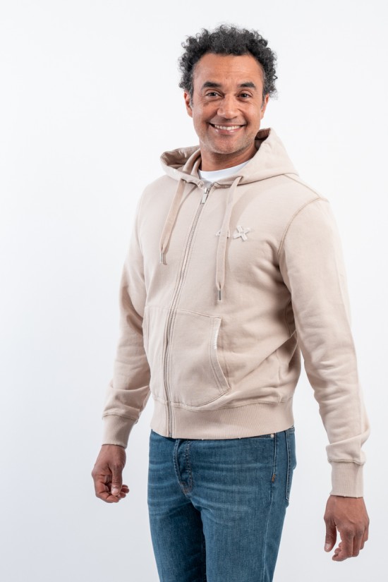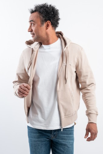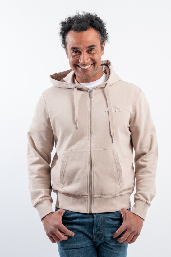 Felpa in cotone elasticizzato con cerniera. Caratterizzata dal logo ricamato con Patch SUN68 tono su tono sul petto. Con cappuccio e coulisse di regolazione. Maniche e fondo a costine. Tasche a marsupio con dettaglio in contrasto.