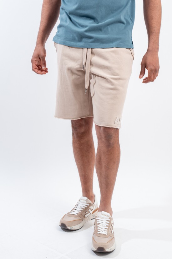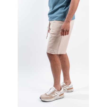 Bermuda jogger SUN68 realizzati in cotone di alta qualità. Vita elasticizzata e coulisse regolabile da corda fluo. Doppie tasche a filo laterali e tasca a con cerniera fianco, completano il capo. Impreziosito da patch con logo iconico ricamato sul fondo. Trattamento vintage Washed. Dettagli ricamati a contrasto. Vestibilità regular.