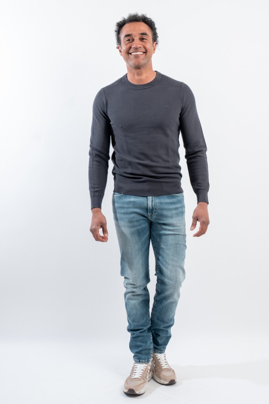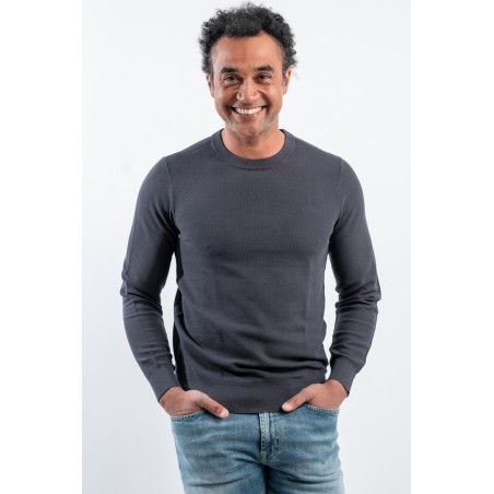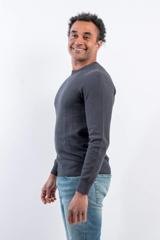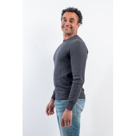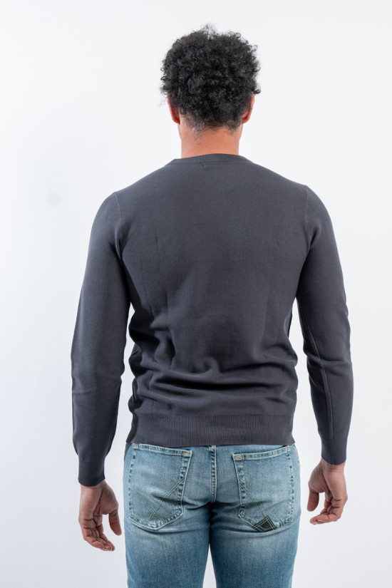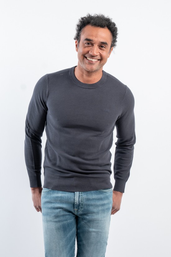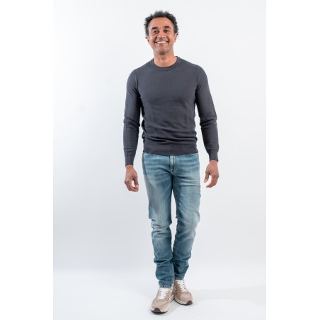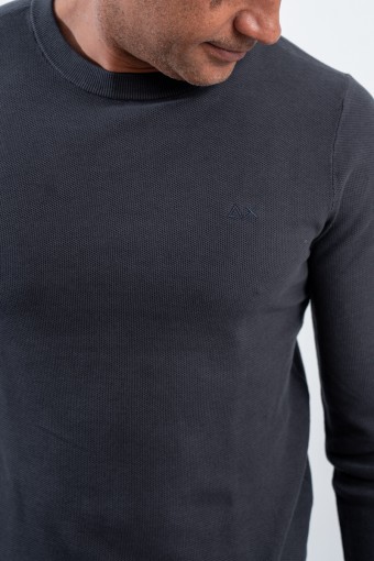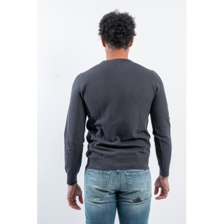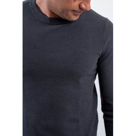 Maglia girocollo realizzata in 100% cotone con lavorazione punto riso. Polsini, scollo e fondo sono rifiniti a coste. Il colore è dato a capo finito per conferire al capo un aspetto vintage e particolare che lo rendono unico.
