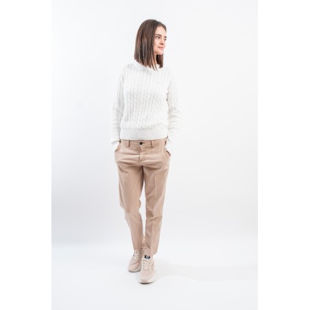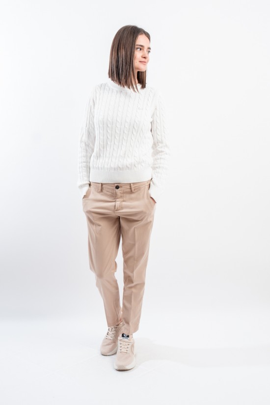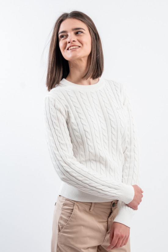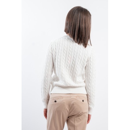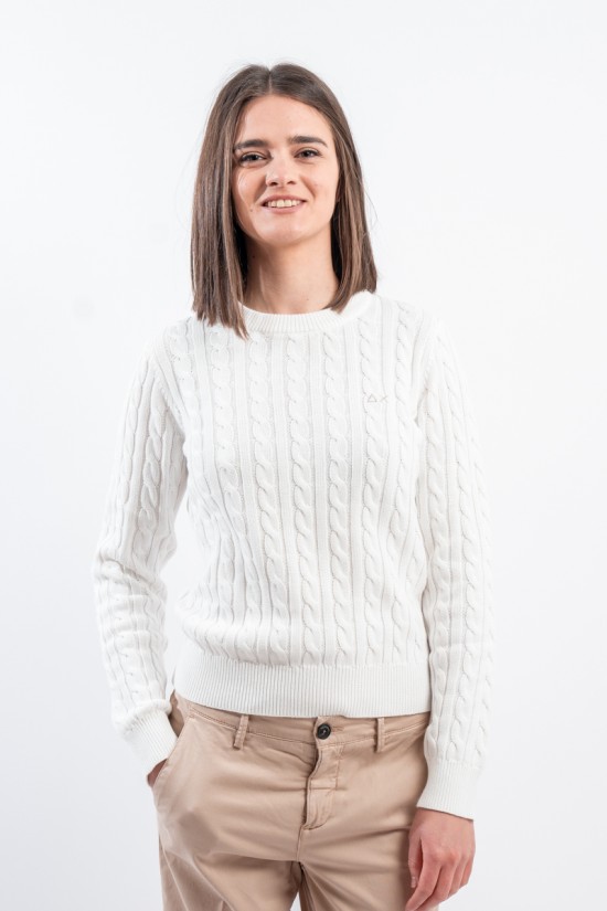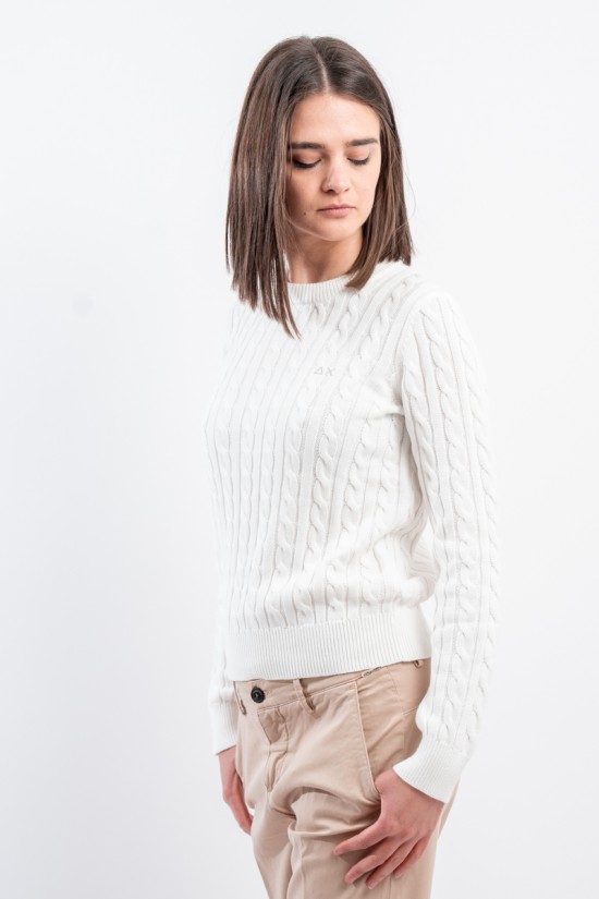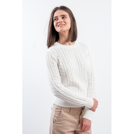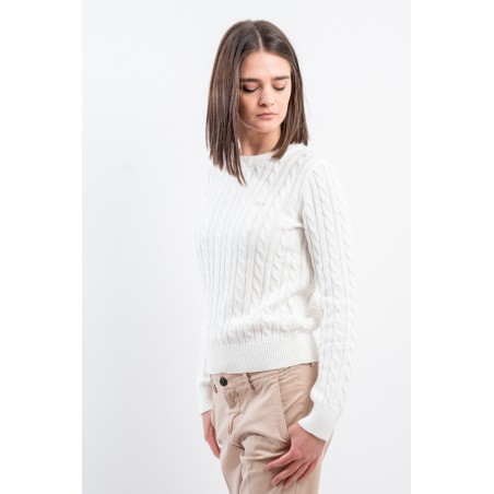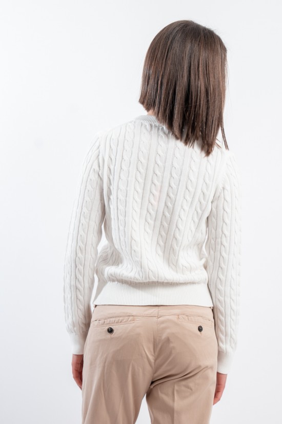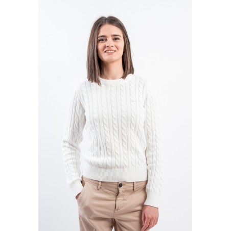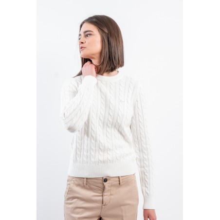 Maglia girocollo realizzata in 100% cotone. Caratterizzata dalla lavorazione a treccia. Girocollo, polsini e fondo a costine. Vestibilità regolare.