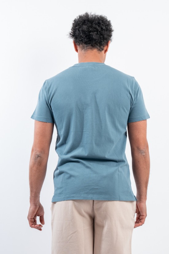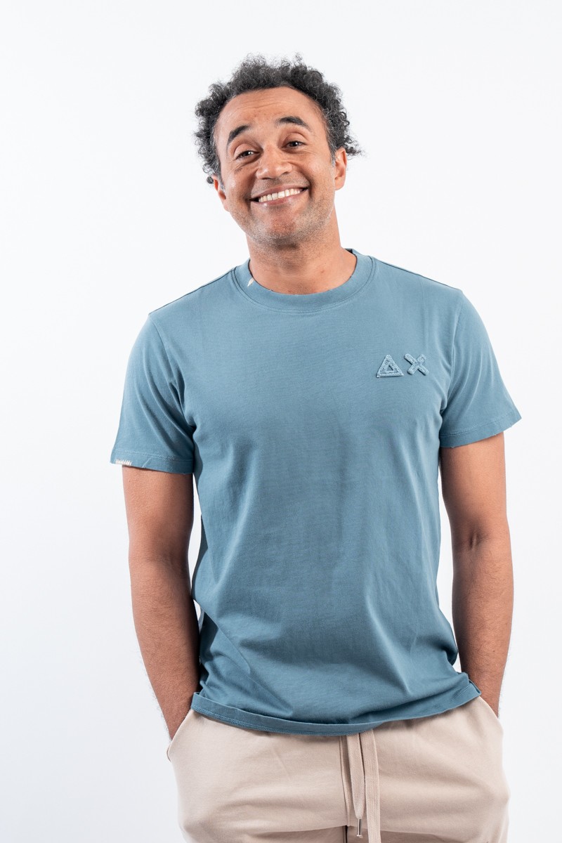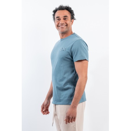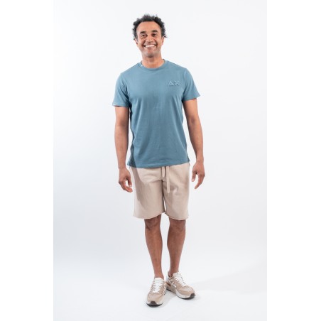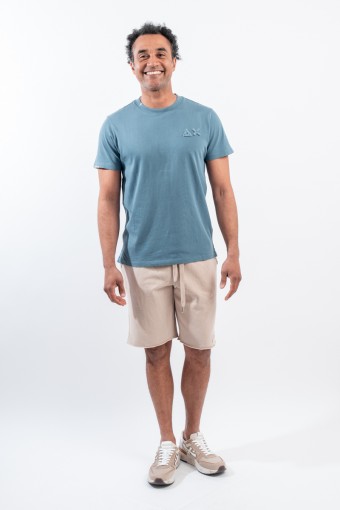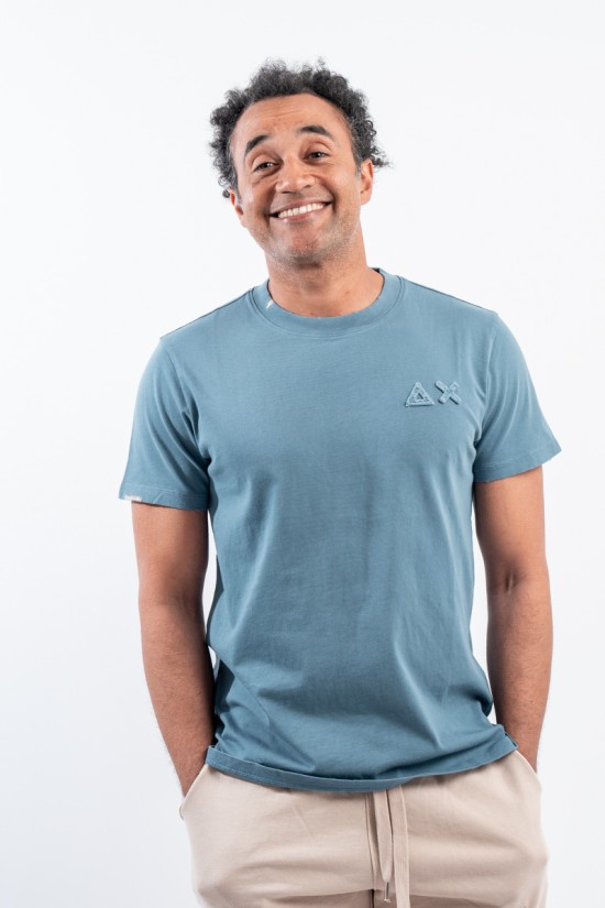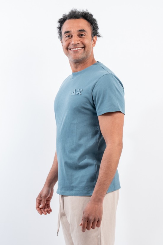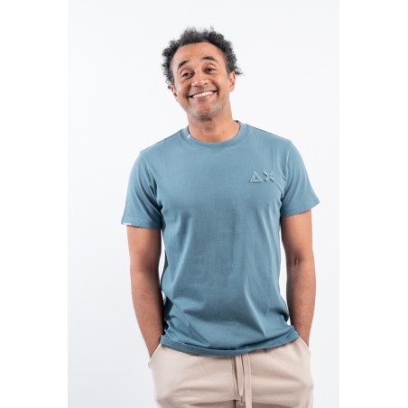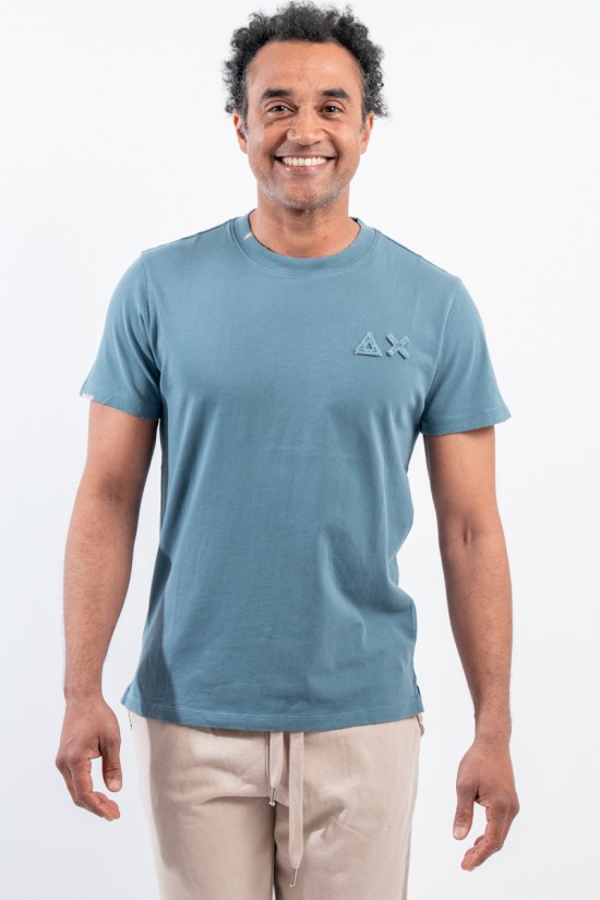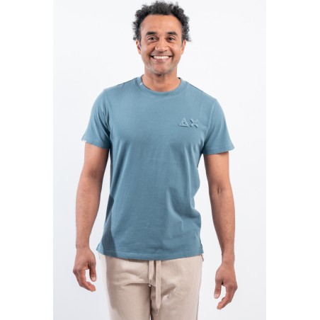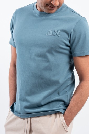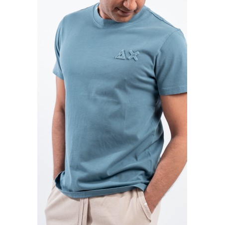 T-shirt SUN68 girocollo realizzata in piquet cotone stretch. Impreziosita da patch con logo istituzionale tinta su tinta ricamato sul petto. Girocollo e bordo delle maniche lavorate a costine. Trattamento vintage Washed.
