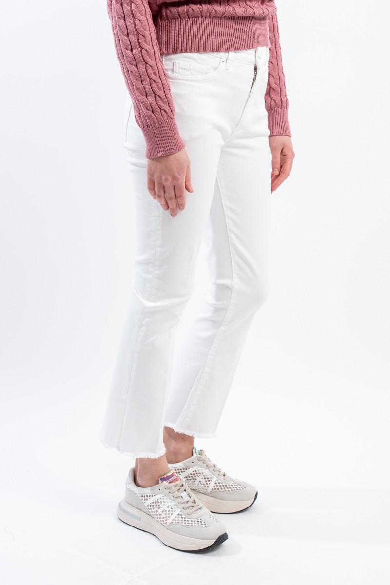 Bull denim bianco, leggero e stretch. Slim fit a trombetta con orlo sfrangiato. Vita altezza media con bottoni silver in risalto. Vestibilità asciutta perfetti per allungare la figura garantendo il massimo comfort.