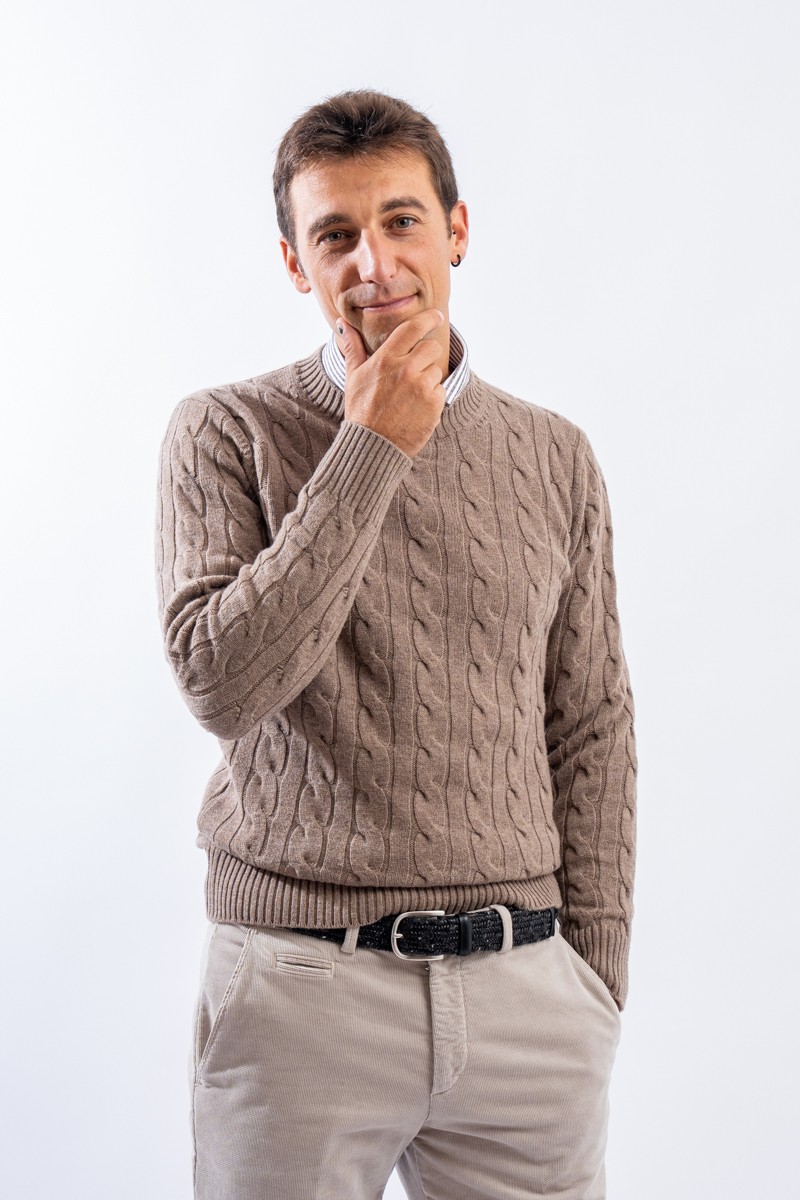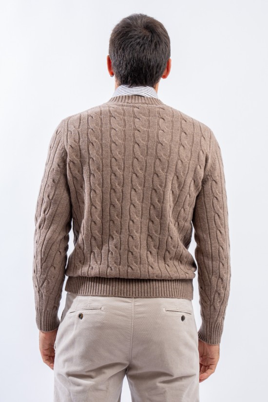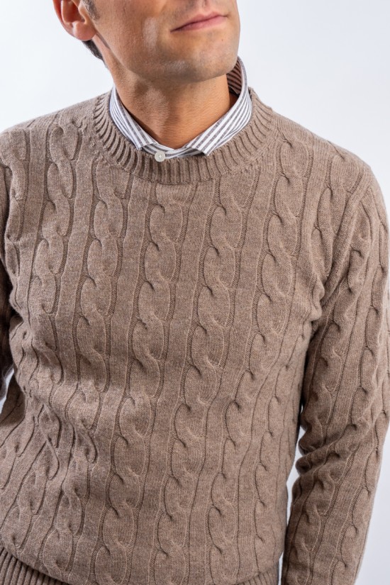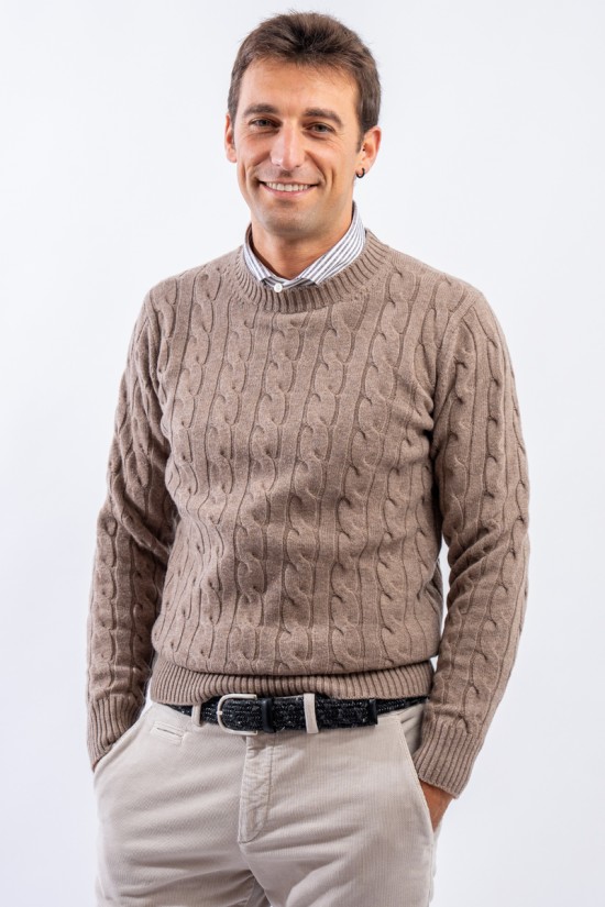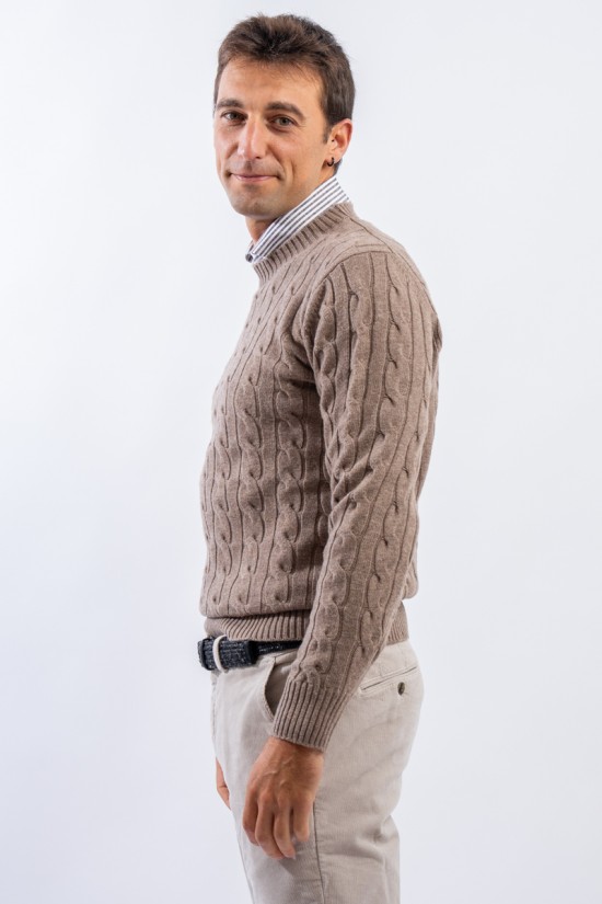 Elegante maglia girocollo con trecce e coste. E' realizzata in merino extrafino, dall'aspetto ricco e luminoso. Made in Italy.