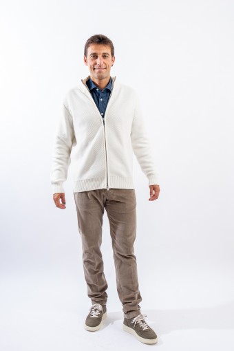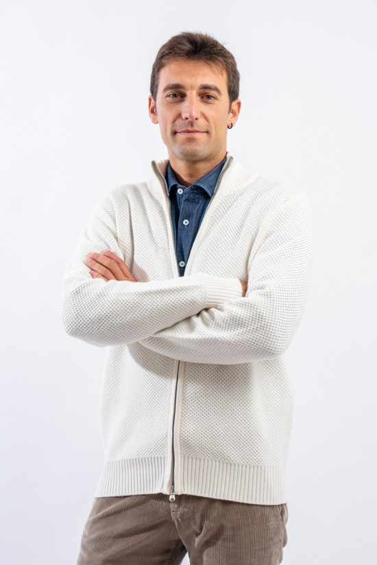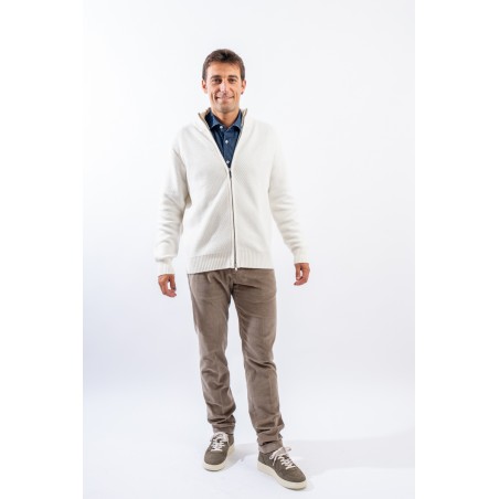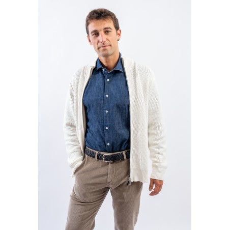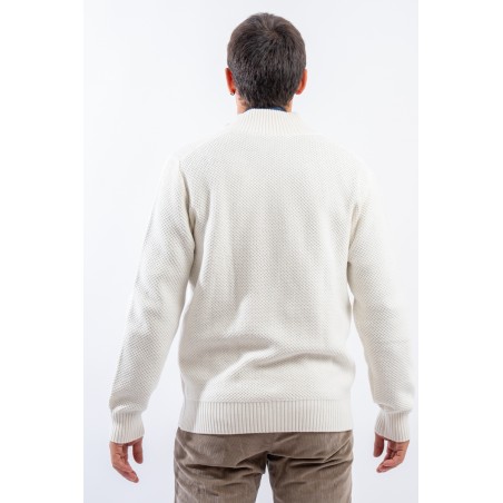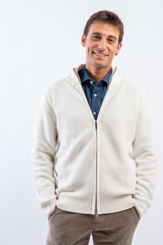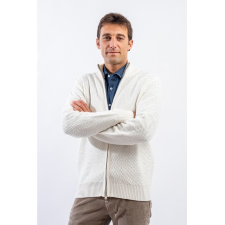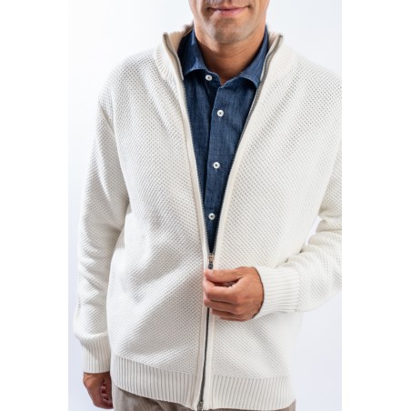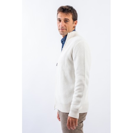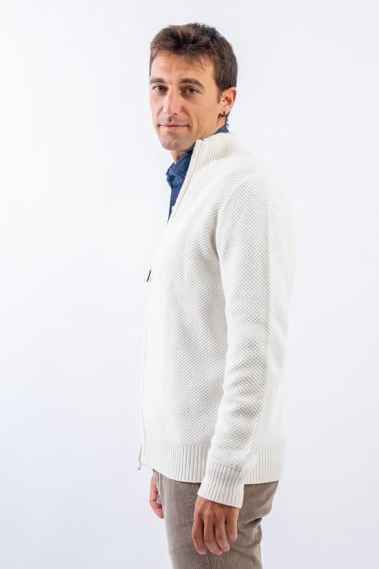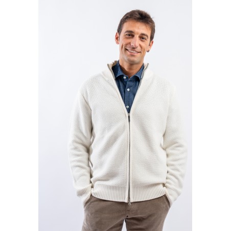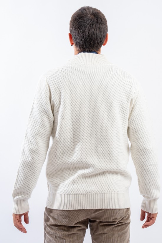 Maglione a collo in piedi con chiusura full zip. Realizzato in misto lana e cotone su finezza 7 è caratterizzato da una lavorazione a nido d’ape calata. Vestibilità regolare. Rifinito dalla lavorazione a coste su collo, polsini e fondo.