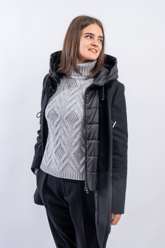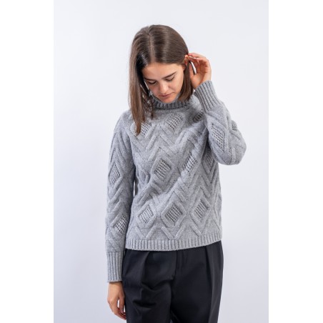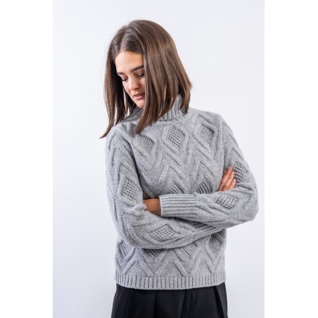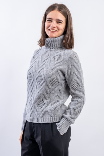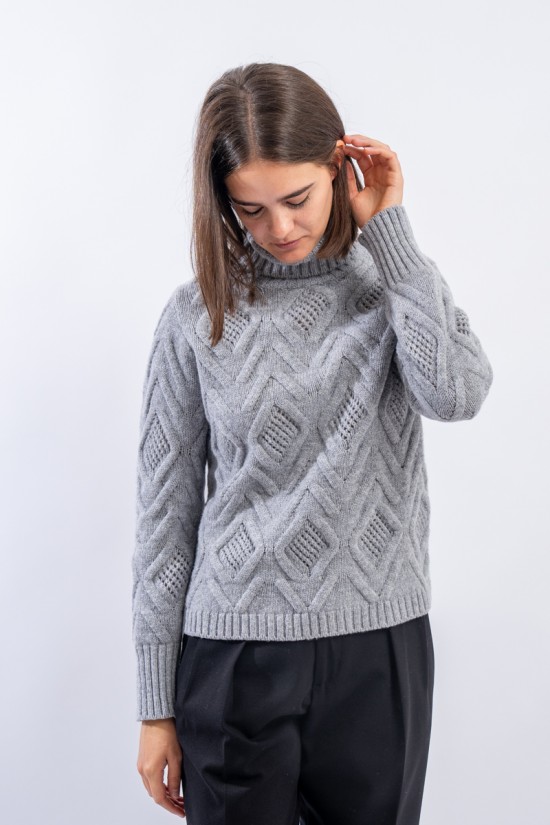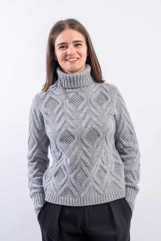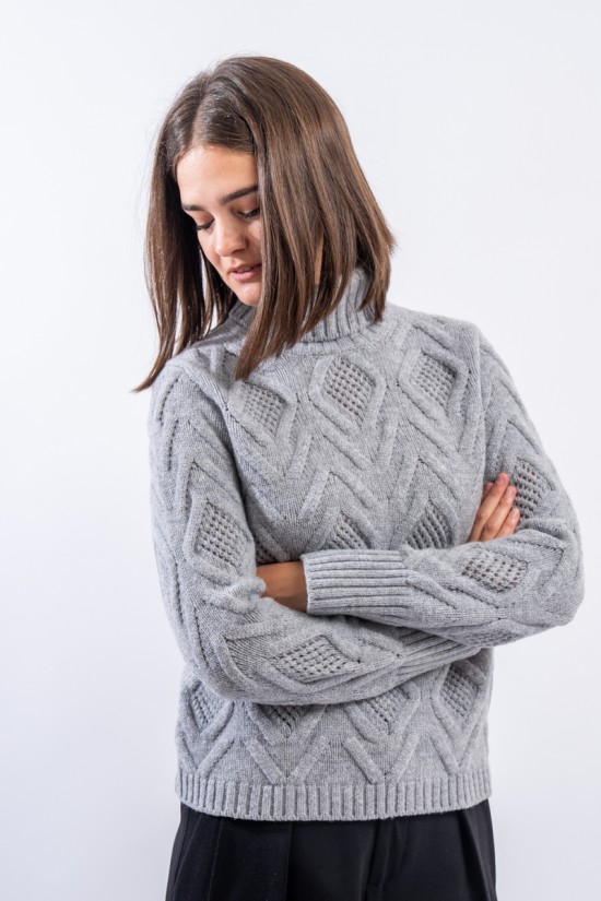 Maglia dolcevita in pura lana lavorata in finezza 5. La lavorazione a losanghe effetto punzonato impreziosisce il capo rendendolo speciale e raffinato. Bordi a costine, vestibilità regular fit. Made in Italy.
