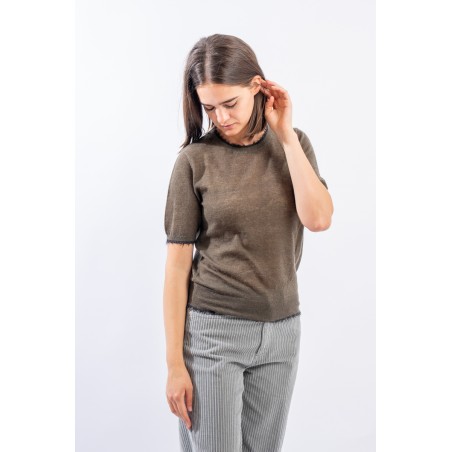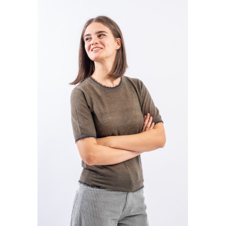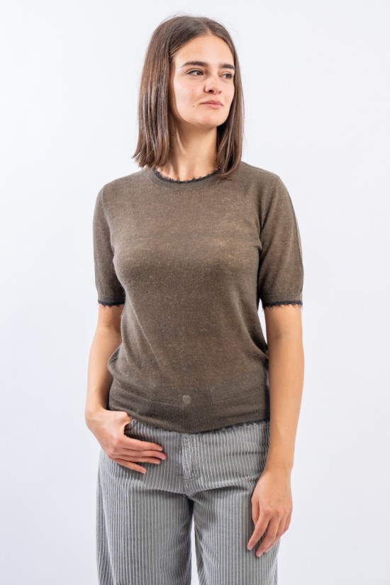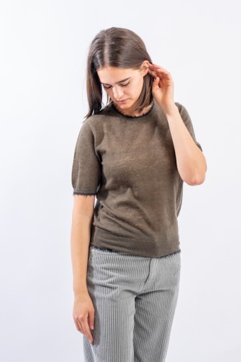 Maglia girocollo con maniche al gomito realizzata in un leggero filato di lana e alpaca perfetto come sotto giacca in ambienti riscaldati. Presenta rifiniture sfrangiate sul collo e sui profili che donano un tocco attuale e ricercato. Made in Italy.