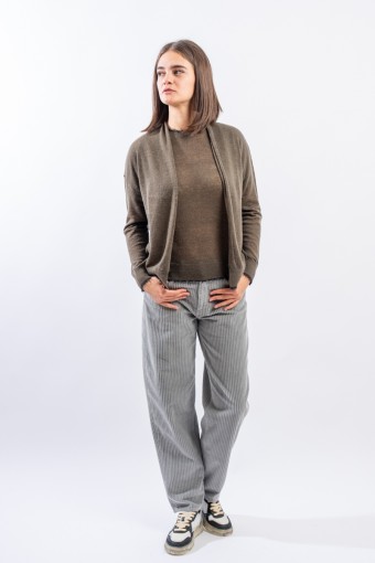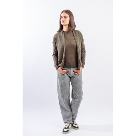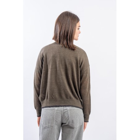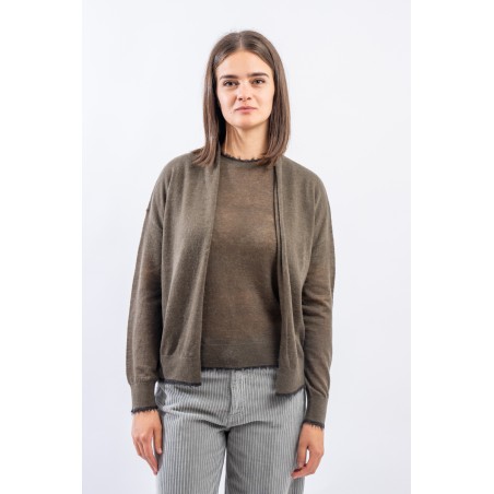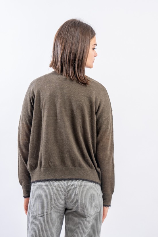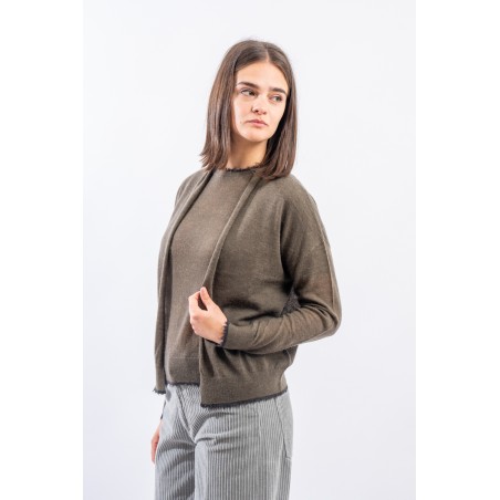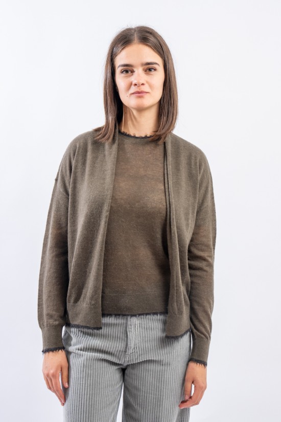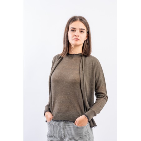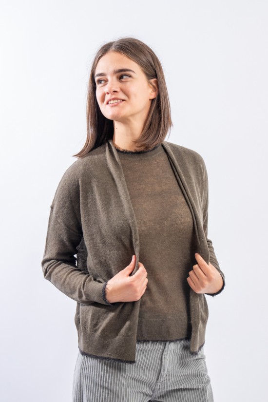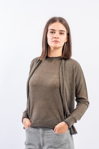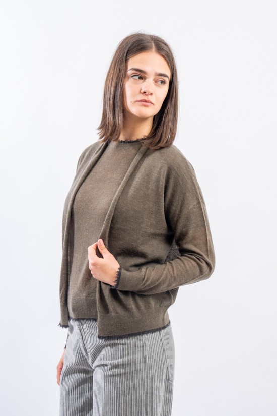Maglia aperta realizzata in un pregiato filato di lana e alpaca perfetto in ambienti caldi e riscaldati. Presenta rifiniture sfrangiate sui profili che donano un tocco attuale e ricercato. Made in Italy.