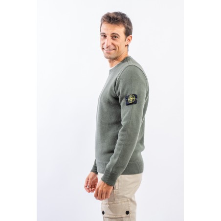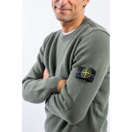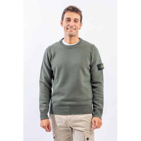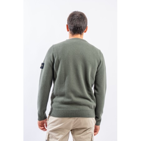 Iconica maglia girocollo in lambswool con intarsio sul giromanica, collo e bordi a costine. Finezza 7 con immancabile badge applicato.