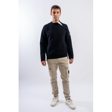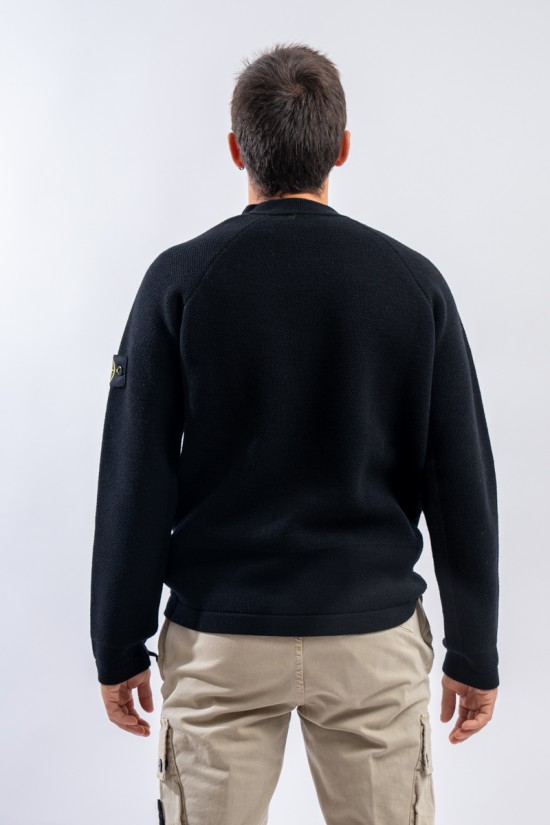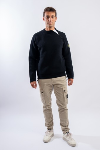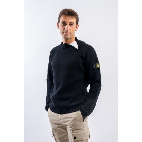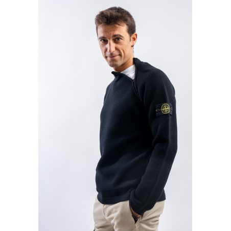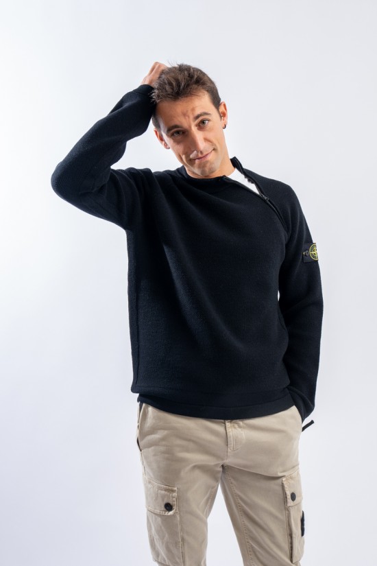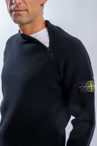 Maglione intarsiato a nido d'ape elasticizzato. Caratterizzato dal collo a luppetto con zip diagonale, polsini elasticizzati ed iconico badge sulla manica sinistra. Finezza 12.
