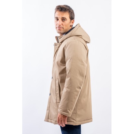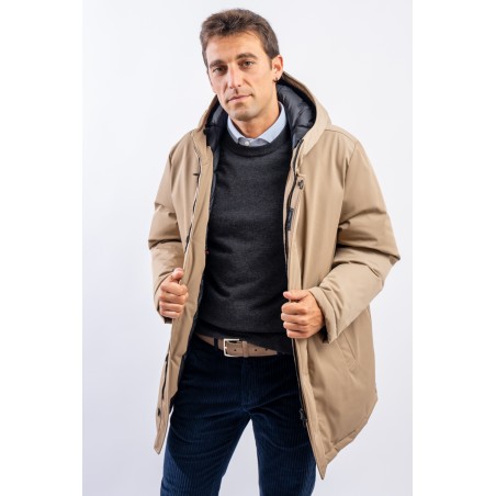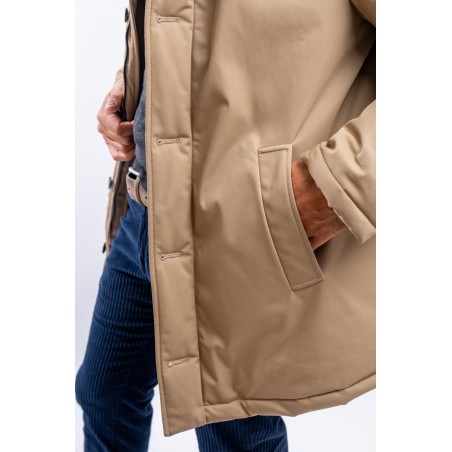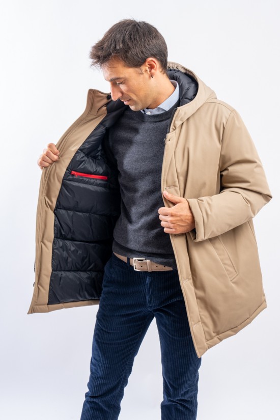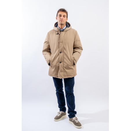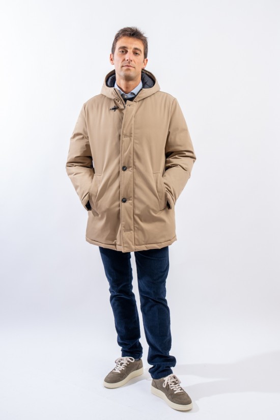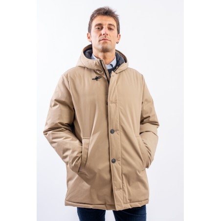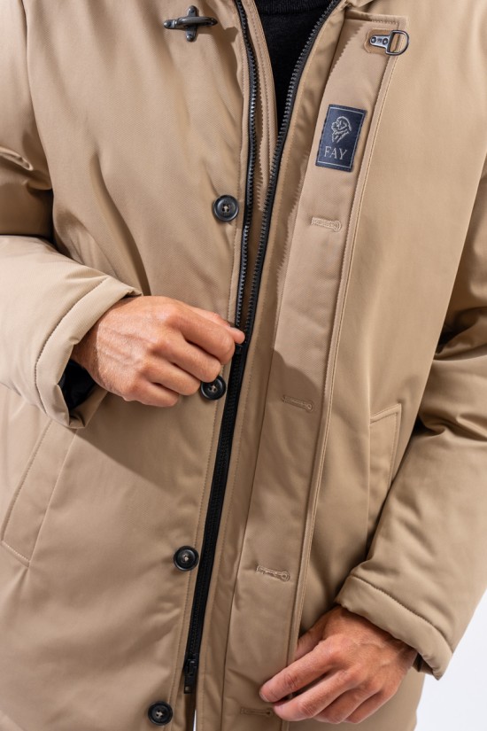 Caban interpretato e rivisto secondo i canonini stilistici del brand. E' realizzato in gabardine tecnico ed imbottito con le migliori piume selezionate. Il tessuto è trattato antigoccia e mantiene la sue caratteristiche di morbidezza e leggerezza. Dotato di tasche a filetto laterali, chiusura con zip e bottoni oltre all'iconico gancio Fay all'altezza del collo. Alleato ideale per affrontare l'inverno con stile!