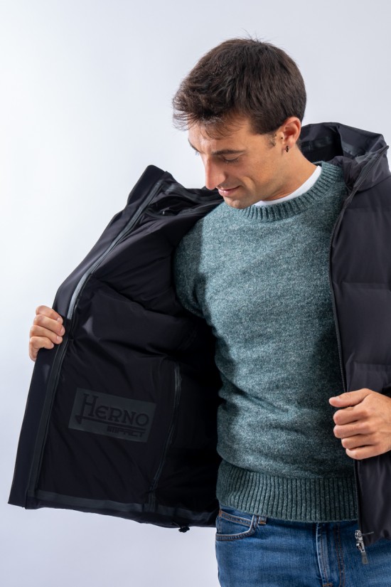 Piumino firmato Herno realizzato in tessuto opaco 4way stretch che unisce comfort e tecnologia. Il materiale morbido e stretch, accoppiato a una membrana impermeabile, windproof e traspirante, garantisce protezione e libertà di movimento. Interamente termosaldato, senza cuciture visibili. Presenta una vestibilità regolare, imbottitura in piuma, trapuntatura a righe e collo alto con cappuccio. La chiusura con zip a doppio cursore assicura praticità e stile. Perfetta per l'urban style, combina cura dei dettagli e performance dei materiali.