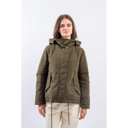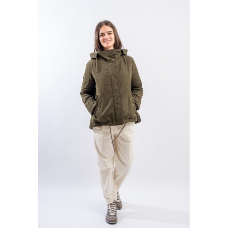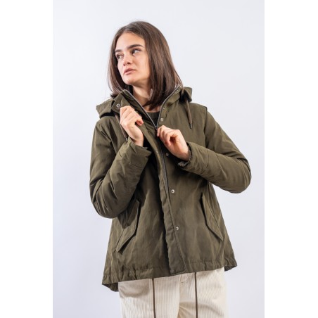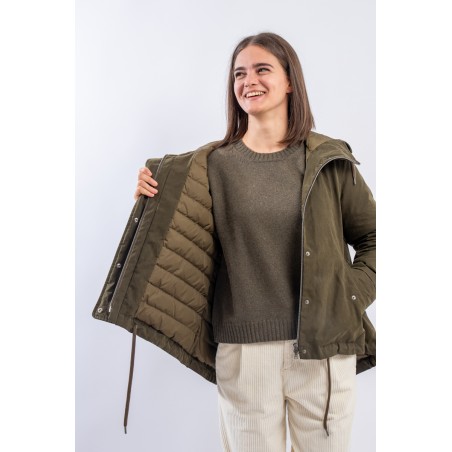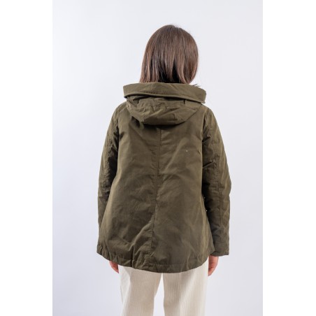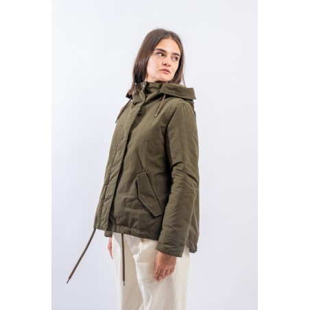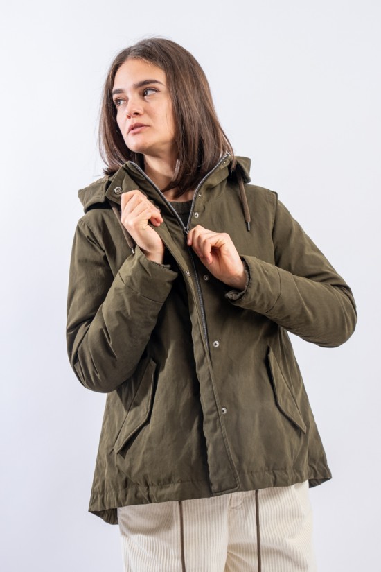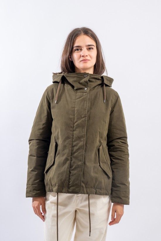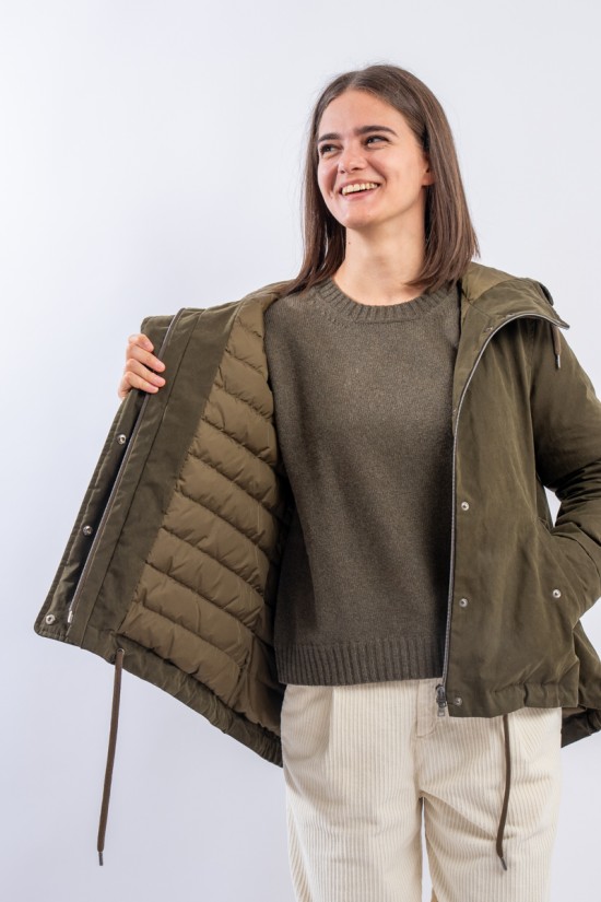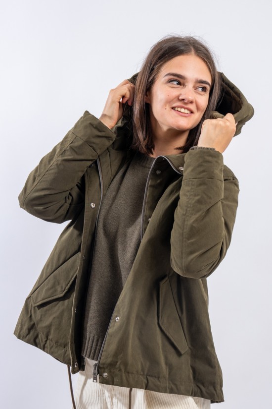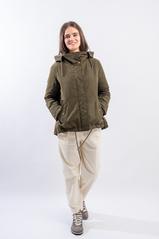 Parka Herno A shape realizzato in un tessuto idrorepellente che combina cotone e poliestere. Appare liscio all'esterno con imbottitura interna in piumino d'oca. Presenta cappuccio fisso regolabile tramite coulisse, chiusura con zip e bottoni automatici nascosti da patta. La linea ad A, leggermente più lunga e stondata sul retro, è dotata di coulisse regolabile sul fondo.