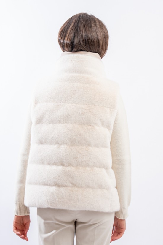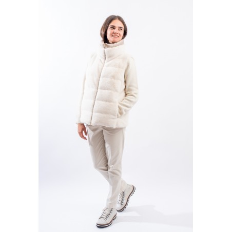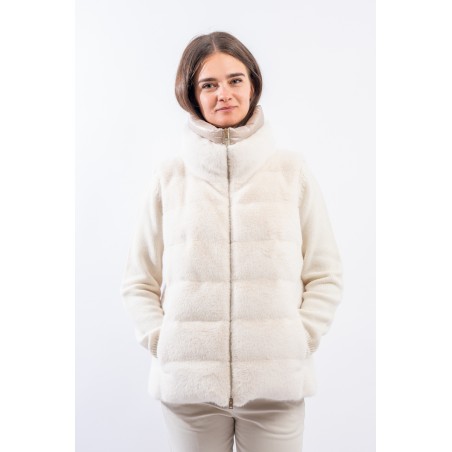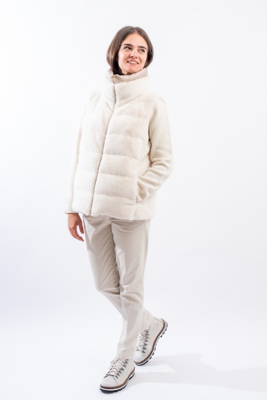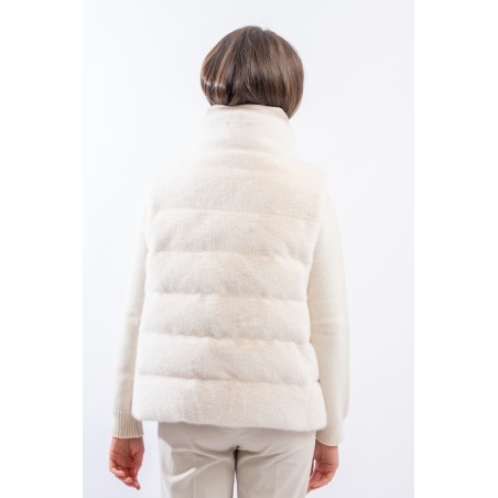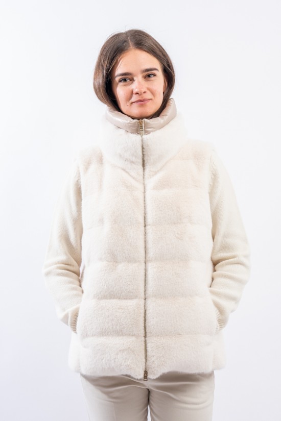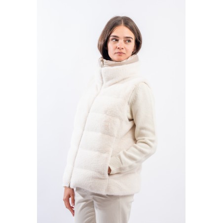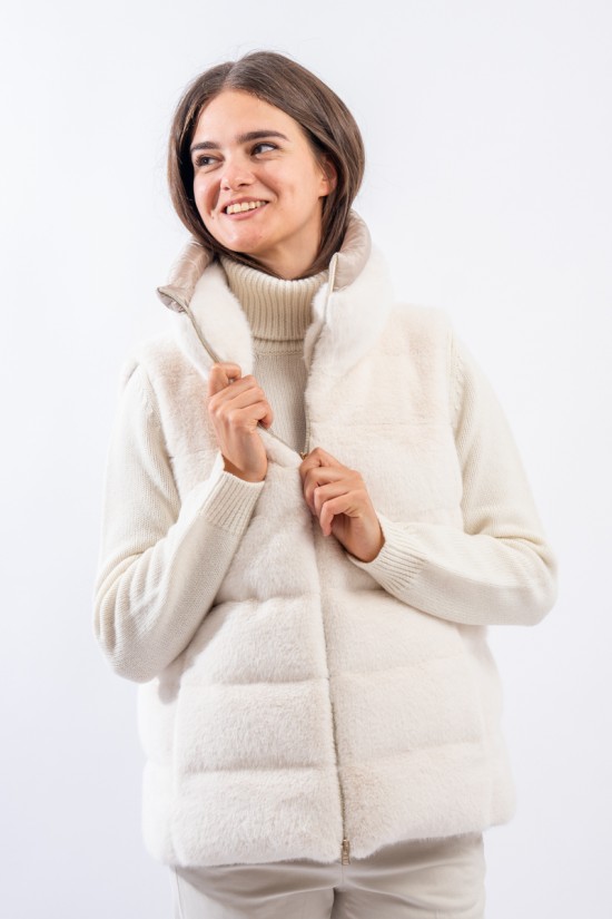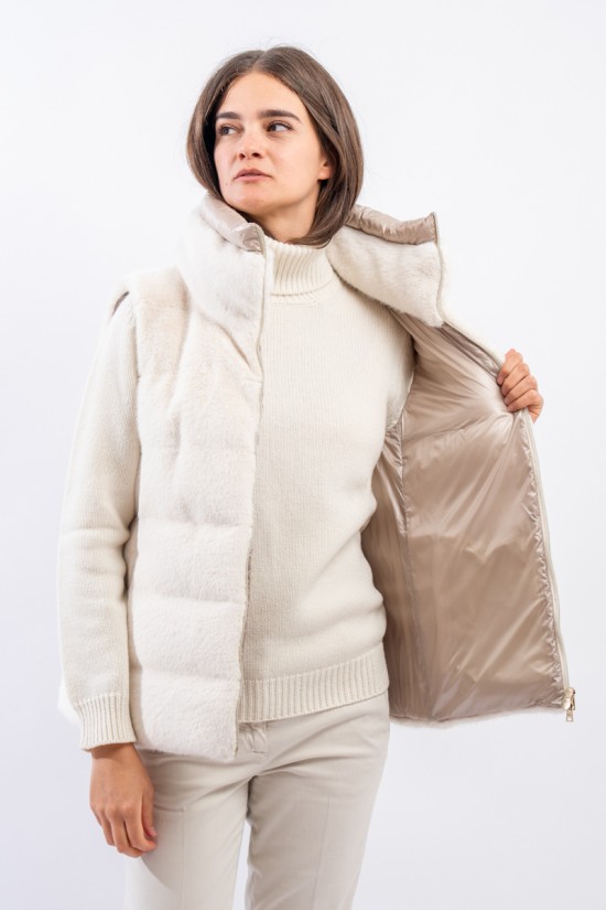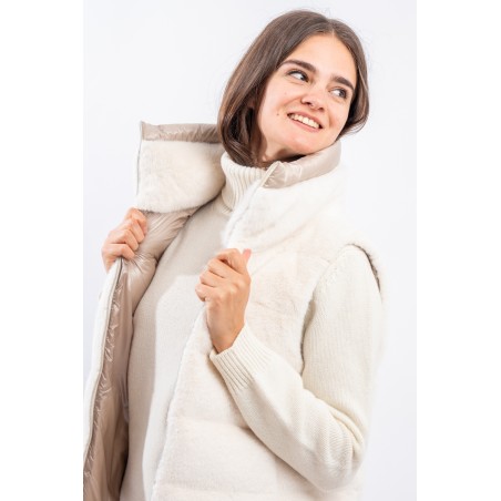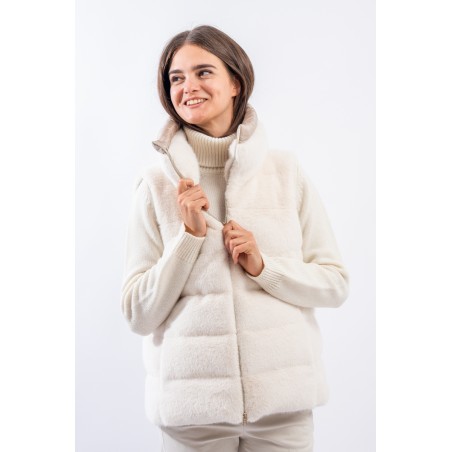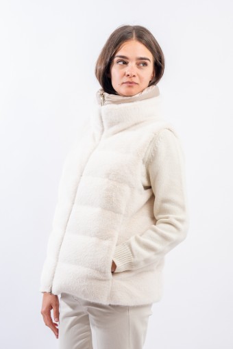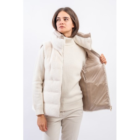 Gilet in piumino realizzato in morbida eco pelliccia con design trapuntato. Caratterizzato dal collo in piedi con inserto in nylon ultralight. Soffice imbottitura in piuma d'oca. Chiusura con zip dorata a doppio cursore, tasche laterali aperte. Un capo femmininile e di grande effetto!