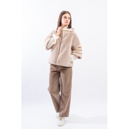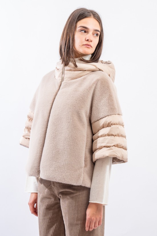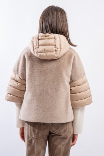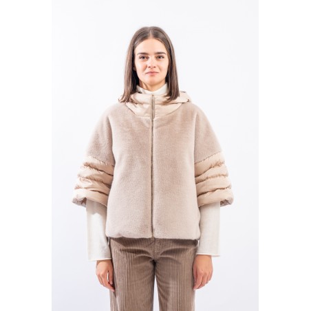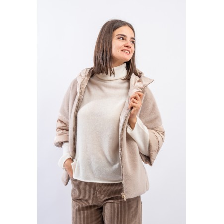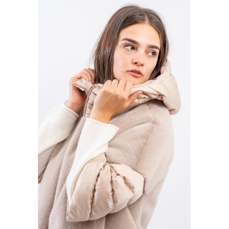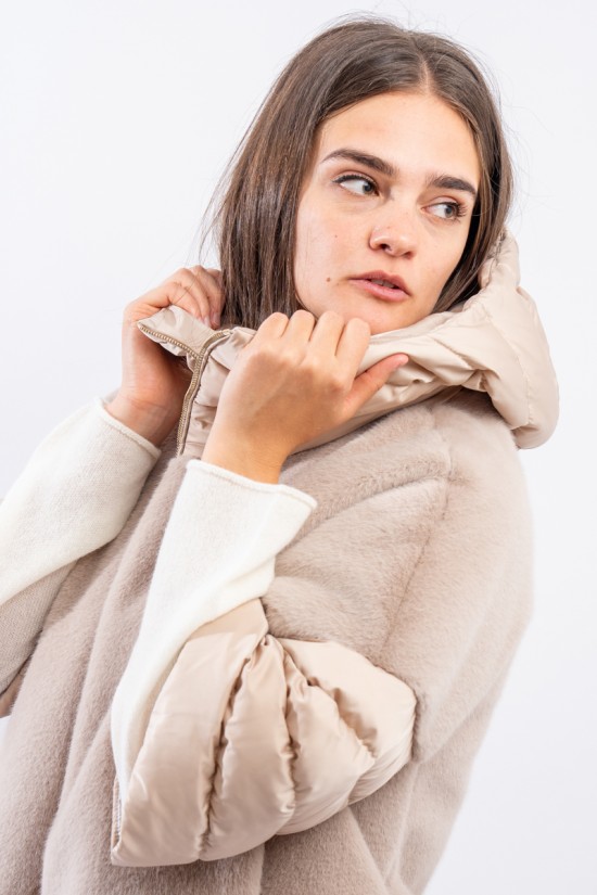 Cappa a shape con manica corta realizzata in bimateriale: cappuccio e maniche con design trapuntato in raso, busto in morbida eco pelliccia. Vestibilità regolare, chiusura con zip dorata a doppio cursore e tasche laterali. Ricercato e femminile come una pelliccia, caldo e confortevole quanto un piumino!