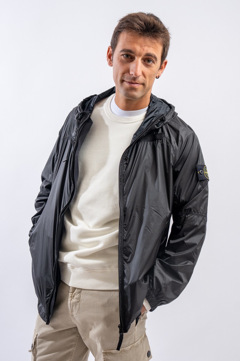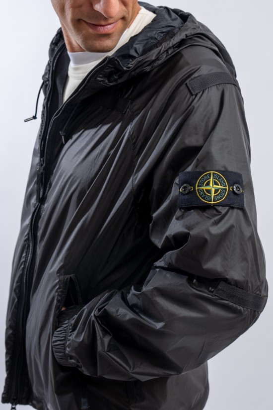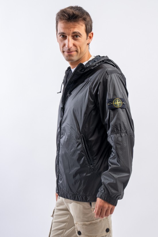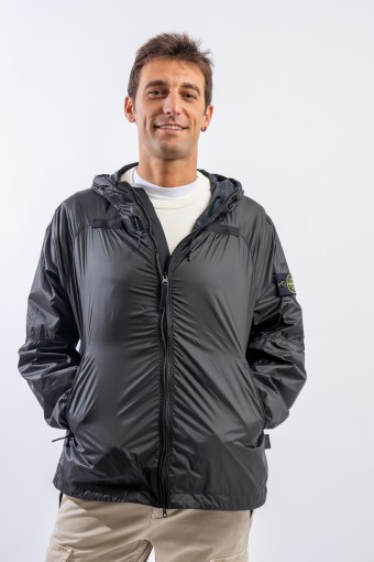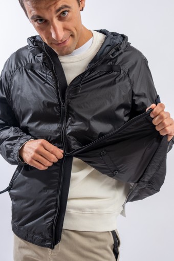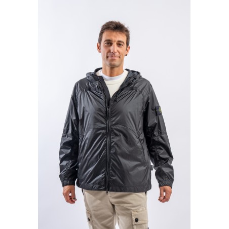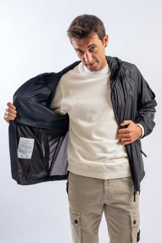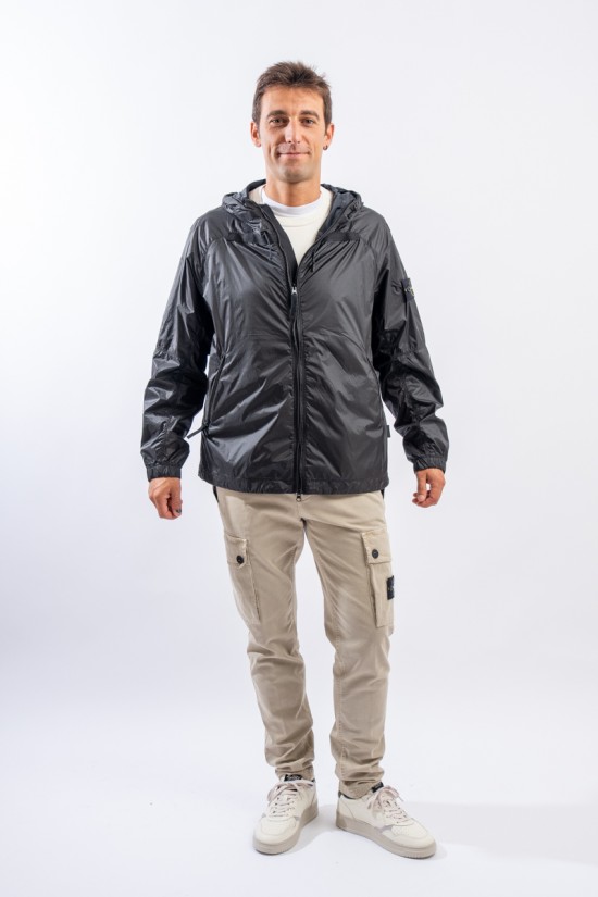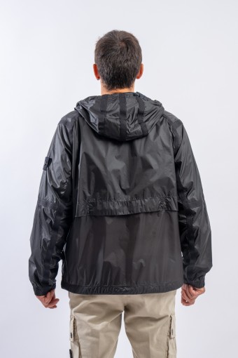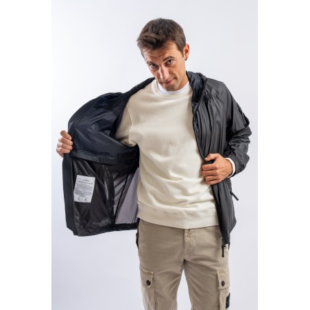 Giacca in nylon ripstop con cappuccio fisso regolabile con coulisse. Risulta essere molto leggero ed altamente resistente. Imprziosito con dettagli in fettuccia riflettente, tasche interne trasparenti e zip a doppio cursore. Il trattamento antigoccia rende il capo idrorepellete.