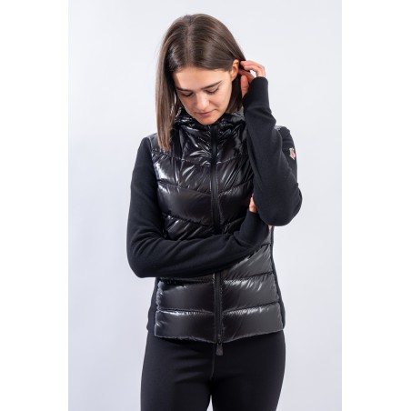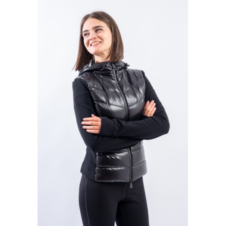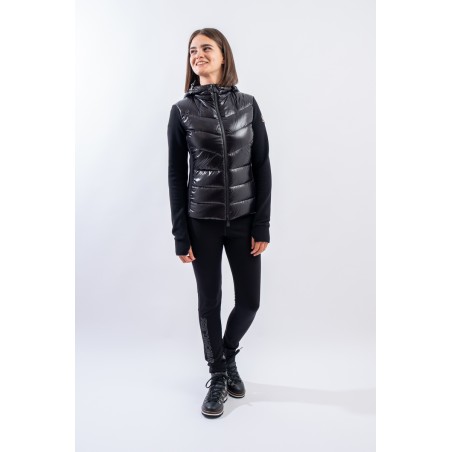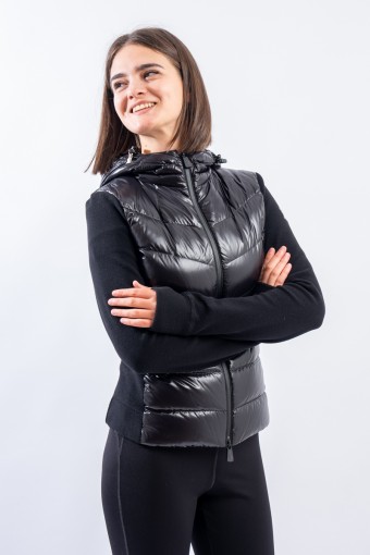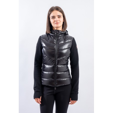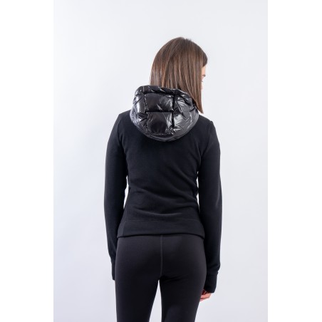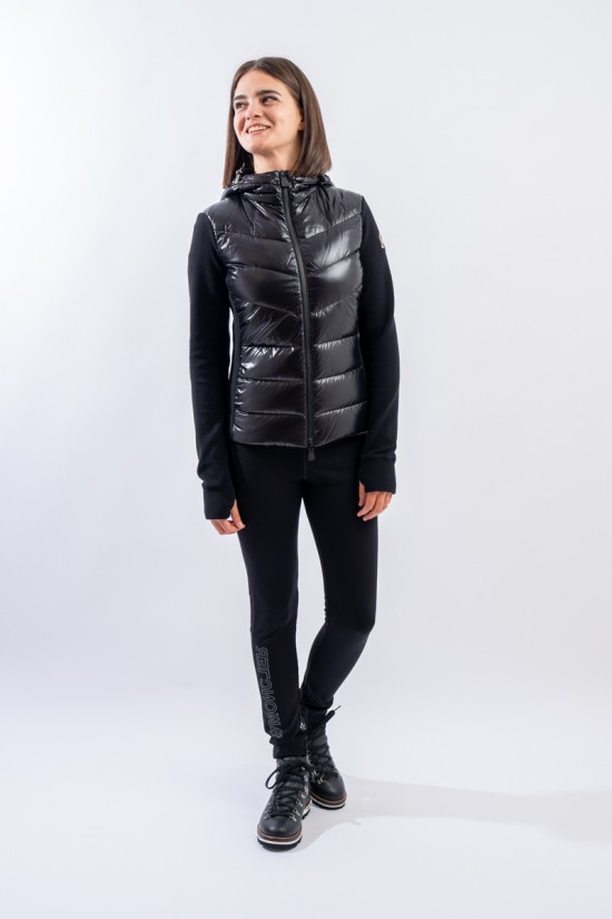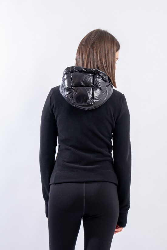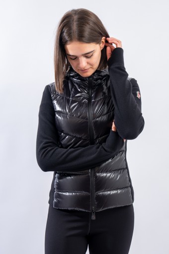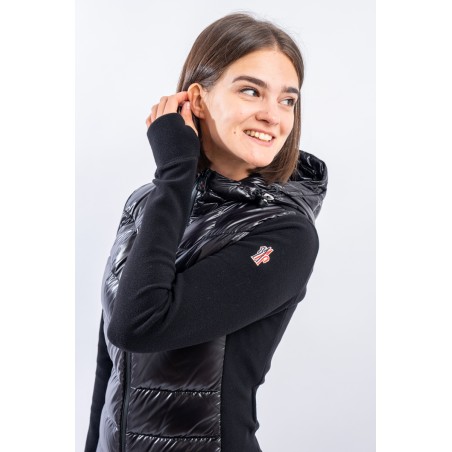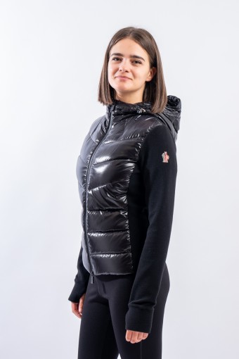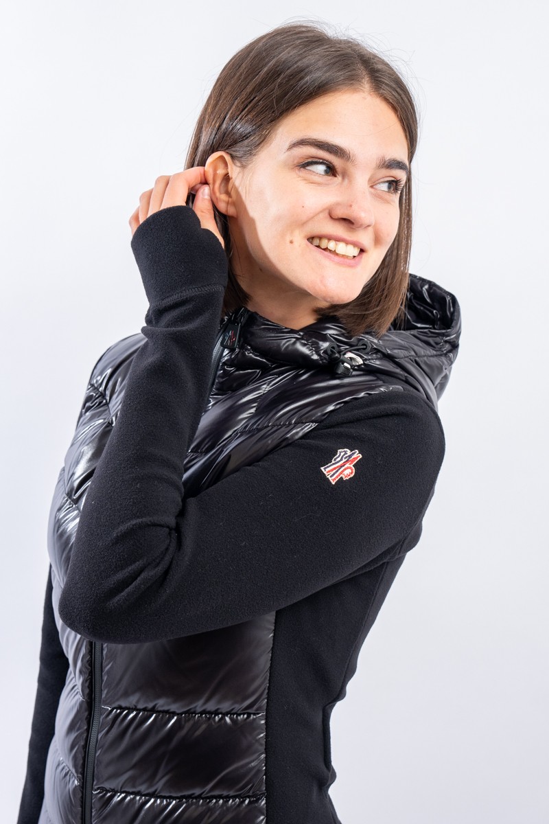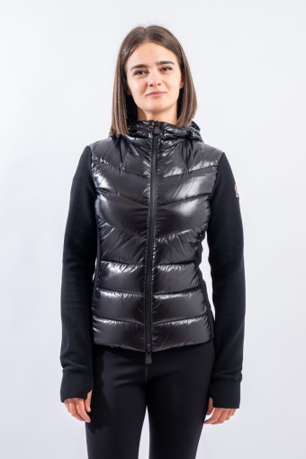 Maglia cardigan realizzata in bimateriale: nylon con imbottitura in pregiato piumino sul davanti e pile stretch rasato su maniche e retro. Trapuntatura esterna in nylon laquè con zip impermeabili e antivento. Cappuccio fisso imbottito regolabile con coulisse. Perfetto da indossare da solo o come secondo strato, saprà aggiungere un tocco di stile ad ogni tuo outfit!