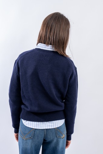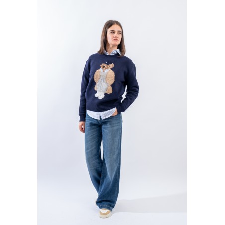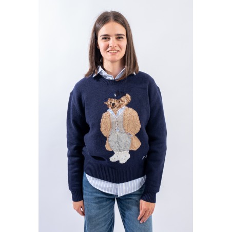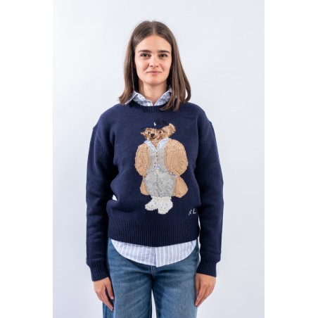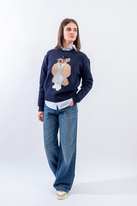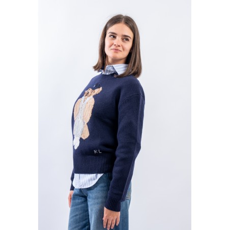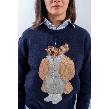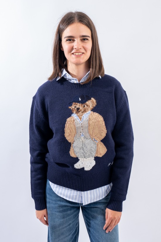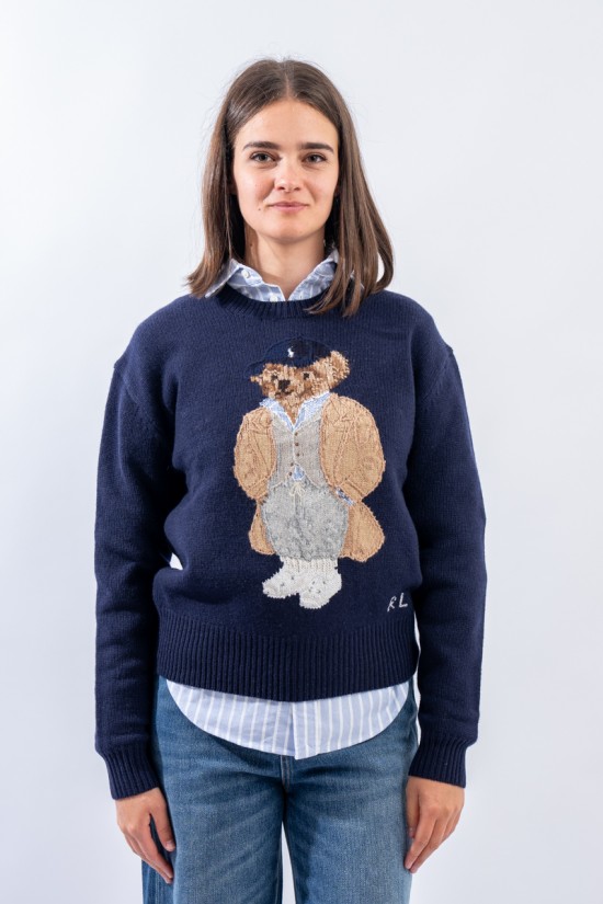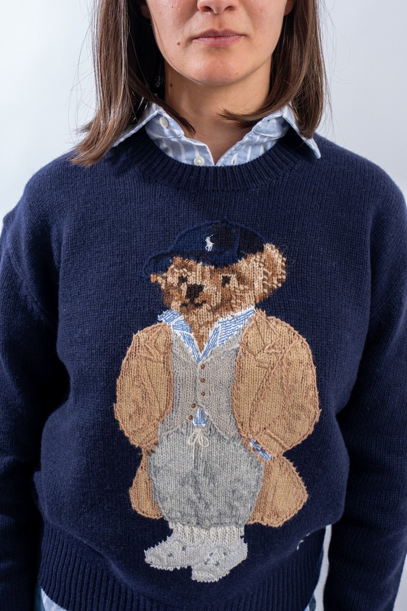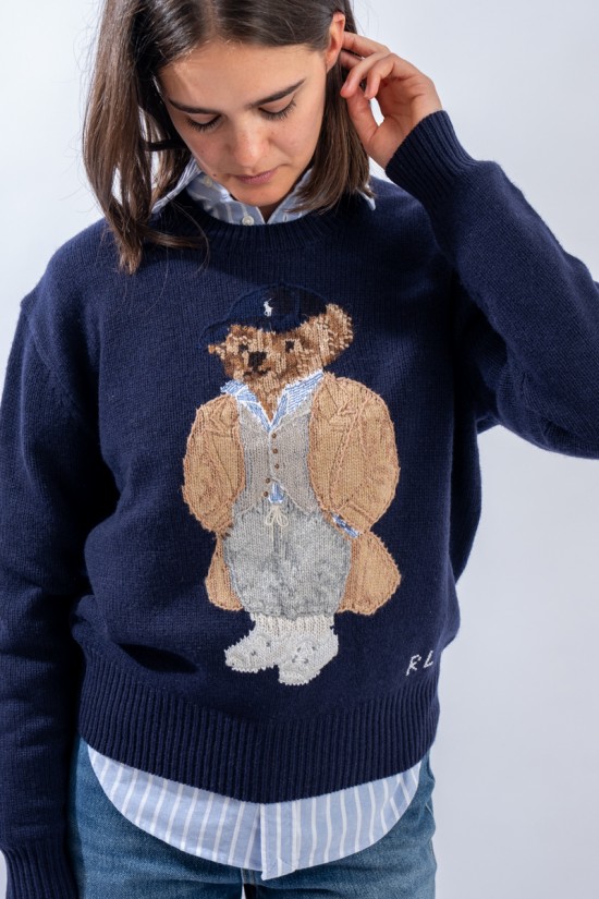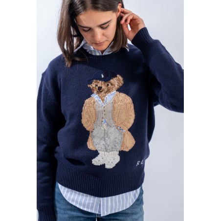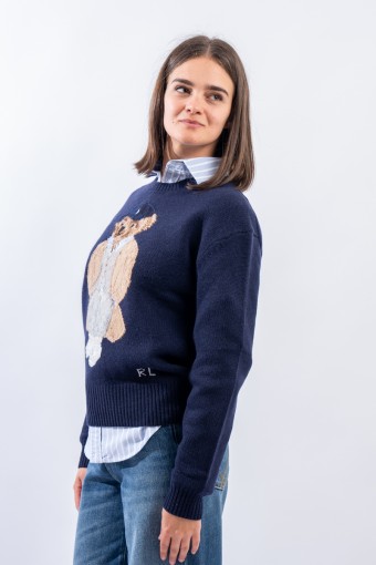 Esclusivo look Ralph Lauren che sfoggia l'iconico Polo Bear. Maglia a intarsi girocollo realizzata in un morbido filato di lana e cashemere. Impreziosita dal monogramma RL lavorato a punto croce sul fianco sinistro. Vestibilità morbida.