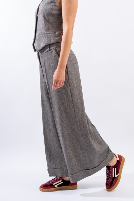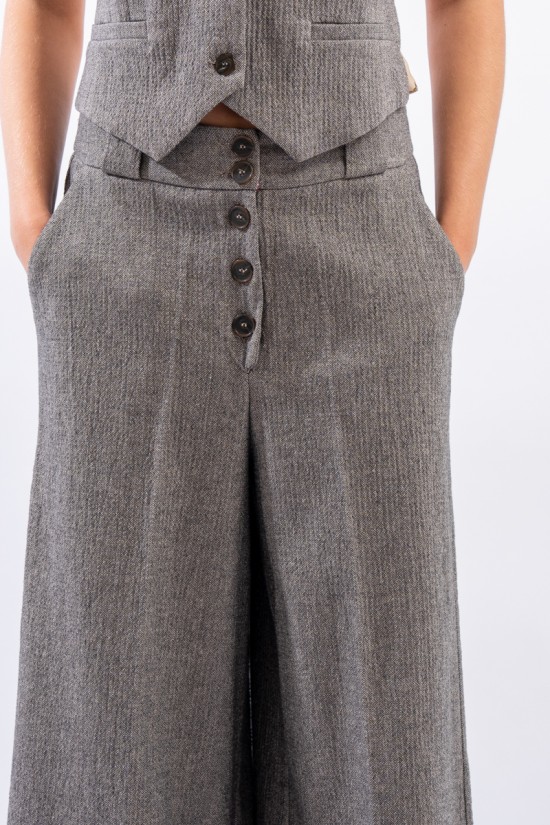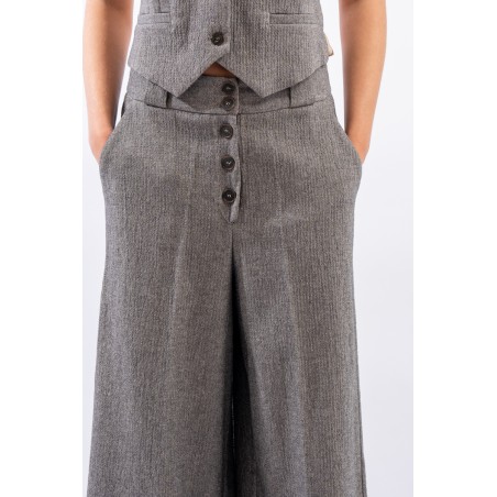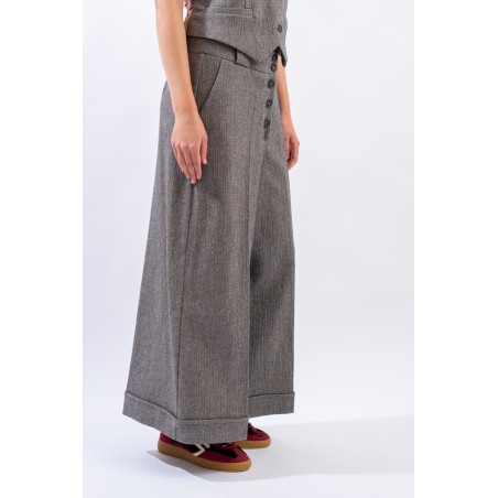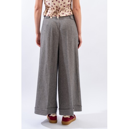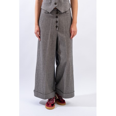 Pantalone a palazzo cropped in cotone stretch con motivo spinato. Impreziosito dalla chiusura con bottoni a vista sul davanti e dalla fodera interna in viscosa con delicata fantasia floreale. Il modello presenta una linea ampia con piega stirata, tasche laterali e risvolto sul fondo. Per un look dal mood sofisticato che combina eleganza sartoriale e comfort contemporaneo.